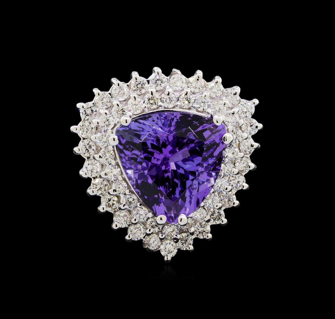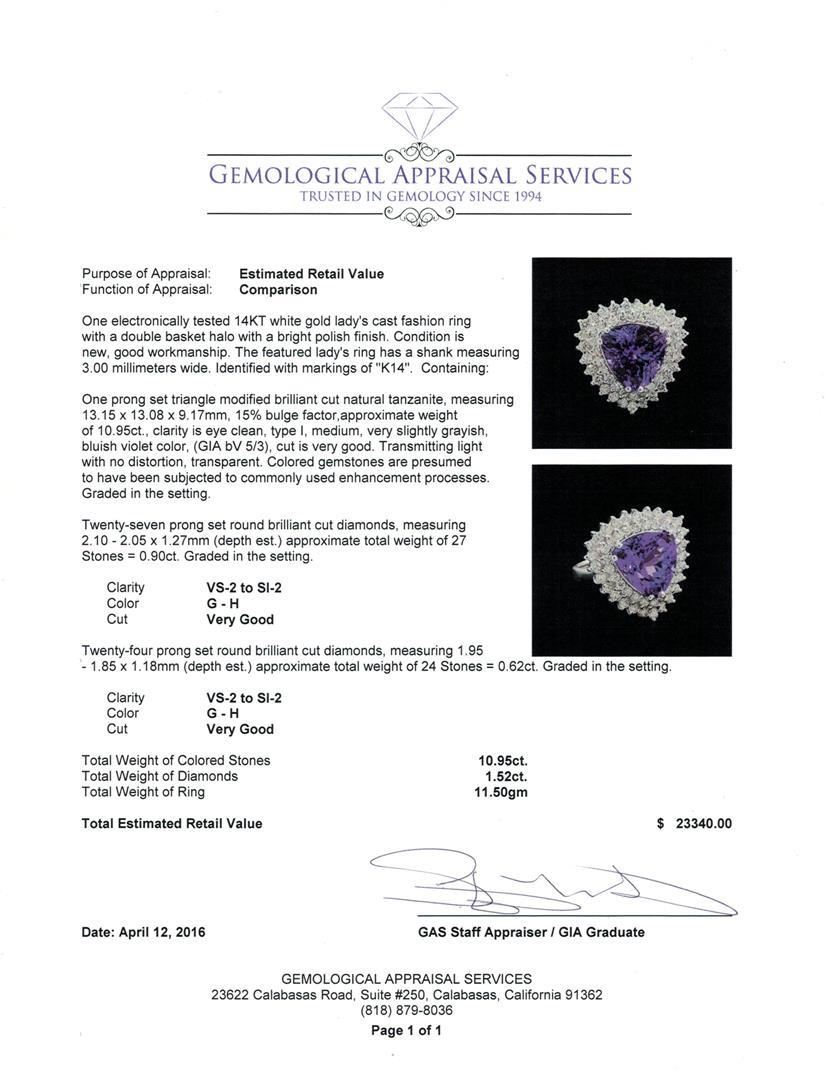 One electronically tested 14KT white gold lady's cast fashion ring with a double basket halo with a bright polish finish. The featured lady's ring has a shank measuring 3.00 millimeters wide. Identified with markings of "K14". Condition is new, good workmanship. Containing: One prong set triangle modified brilliant cut natural tanzanite, measuring 13.15 x 13.08 x 9.17mm, 15%. bulge factor, approximate weight of 10.95ct., clarity is eye clean, type I, medium, very slightly grayish, bluish violet color, (GIA bV 5/3), cut is very good. Transmitting light with no distortion, transparent. Colored gemstones are presumed to have been subjected to commonly used enhancement processes. Graded in the setting. Twenty-Seven prong set round brilliant cut diamonds, measuring 2.10 - 2.05 x 1.27mm (depth est.) approximate total weight of 27 Stones = 0.90 ct. Graded in the setting. Clarity: VS-2 to SI-2. Color: G - Very Good Twenty-Four prong set round brilliant cut diamonds, measuring 1.95 - 1.85 x 1.18mm (depth est.) approximate total weight of 24 Stones = 0.62ct. Graded in the setting. Clarity: VS-2 to SI-2. Color: G - Very Good. Total Weight of Colored Stones 10.95ct. Total Weight of Diamonds 1.52ct. Total Weight of Ring 11.50gm. GAS Appraised.
