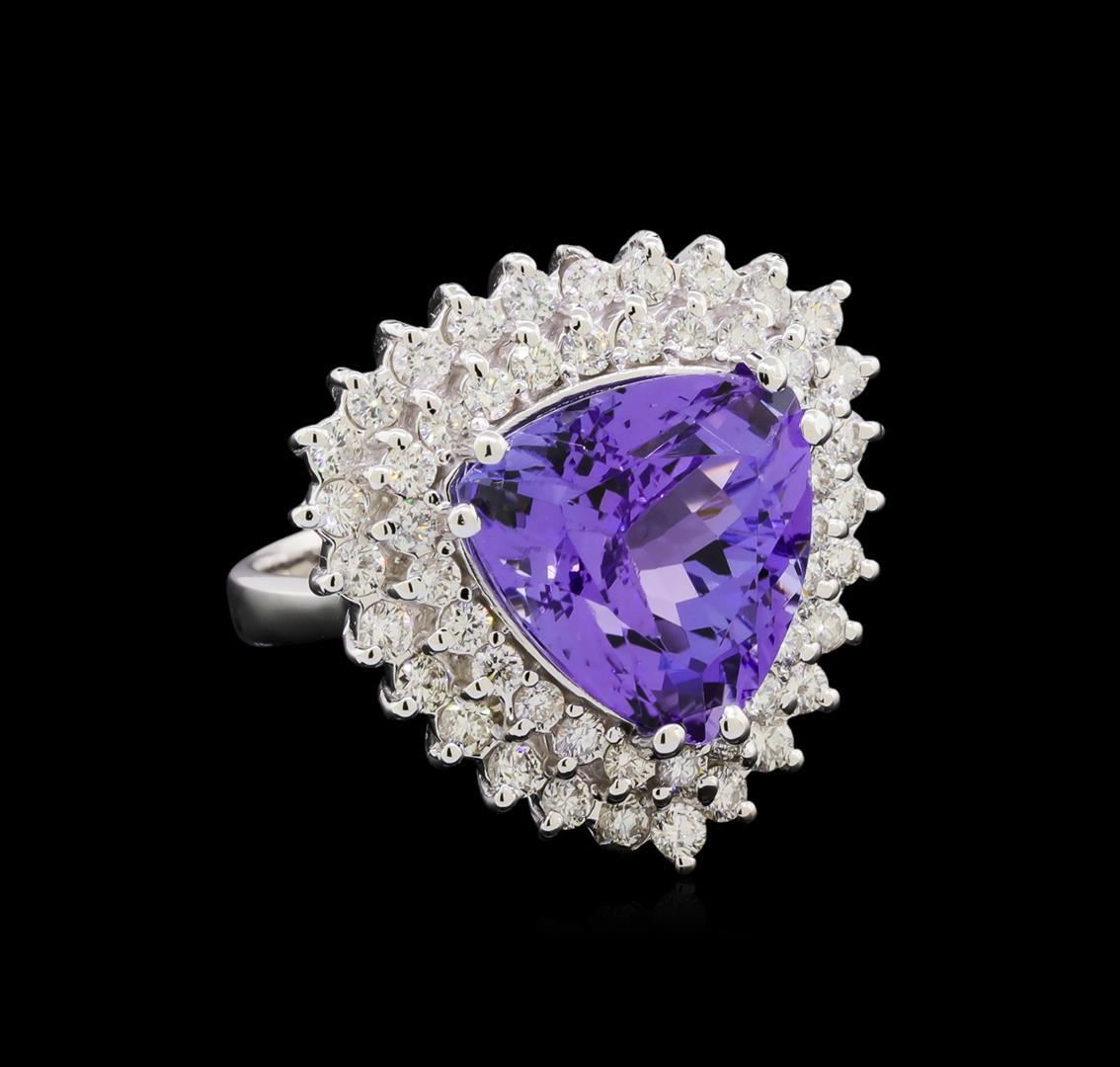 One electronically tested 14KT white gold lady's cast fashion ring with a double basket halo with a bright polish finish. The featured lady's ring has a shank measuring 3.00 millimeters wide. Identified with markings of "K14". Condition is new, good workmanship. Containing: One prong set triangle modified brilliant cut natural tanzanite, measuring 13.15 x 13.08 x 9.17mm, 15%. bulge factor, approximate weight of 10.95ct., clarity is eye clean, type I, medium, very slightly grayish, bluish violet color, (GIA bV 5/3), cut is very good. Transmitting light with no distortion, transparent. Colored gemstones are presumed to have been subjected to commonly used enhancement processes. Graded in the setting. Twenty-Seven prong set round brilliant cut diamonds, measuring 2.10 - 2.05 x 1.27mm (depth est.) approximate total weight of 27 Stones = 0.90 ct. Graded in the setting. Clarity: VS-2 to SI-2. Color: G - Very Good Twenty-Four prong set round brilliant cut diamonds, measuring 1.95 - 1.85 x 1.18mm (depth est.) approximate total weight of 24 Stones = 0.62ct. Graded in the setting. Clarity: VS-2 to SI-2. Color: G - Very Good. Total Weight of Colored Stones 10.95ct. Total Weight of Diamonds 1.52ct. Total Weight of Ring 11.50gm. GAS Appraised.