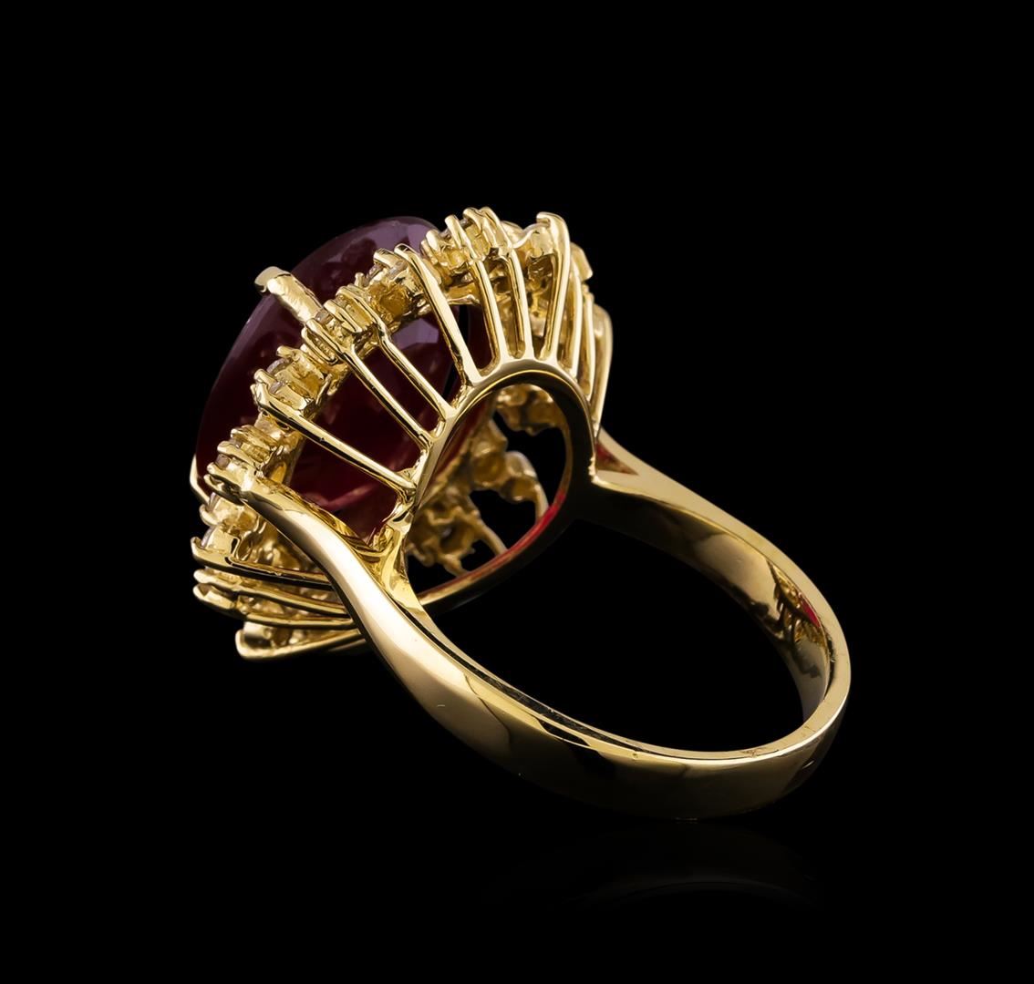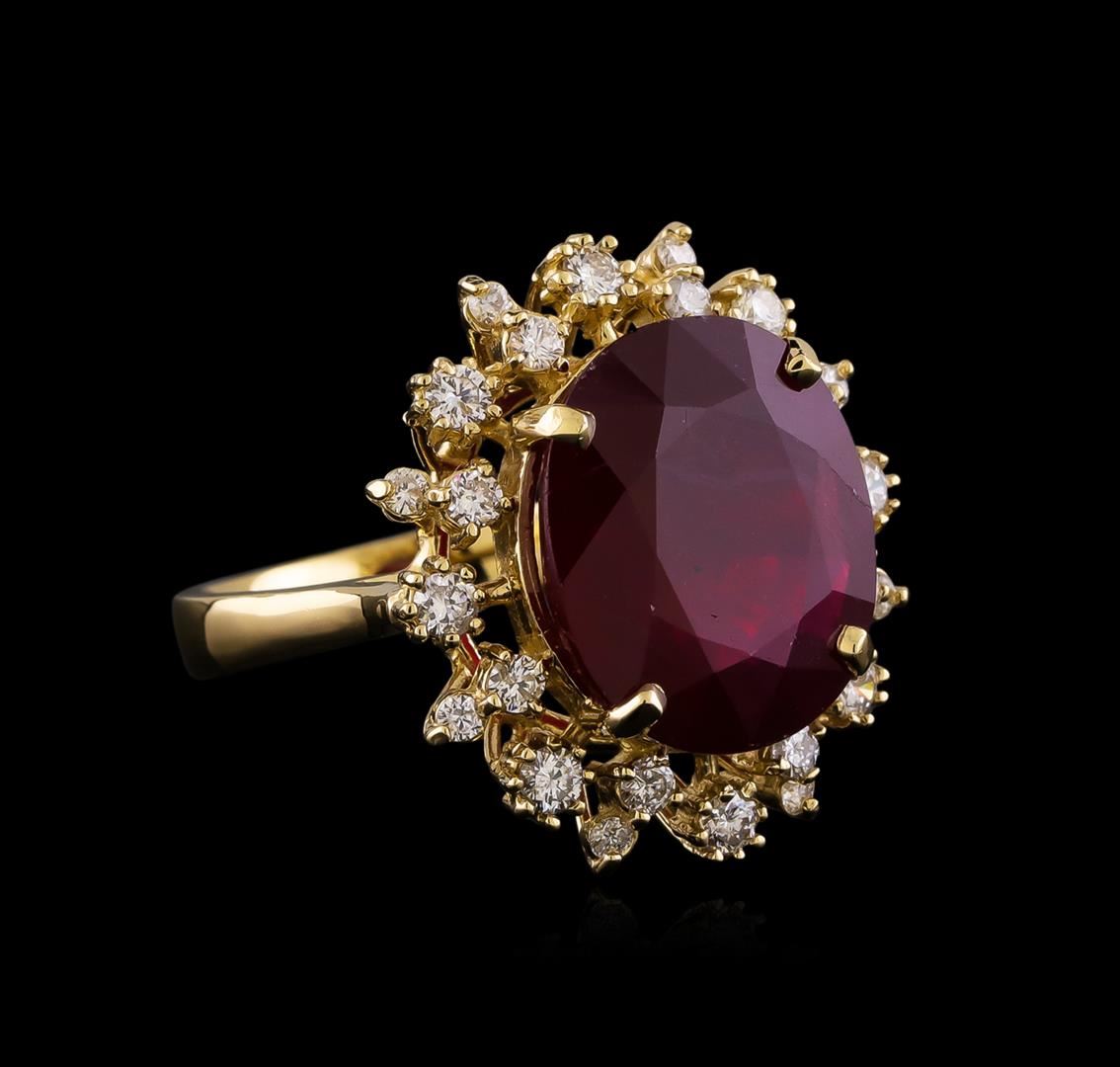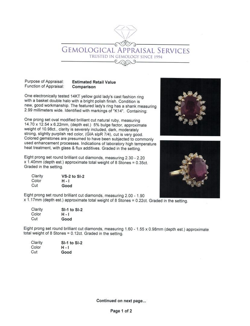 One electronically tested 14KT yellow gold lady's cast fashion ring with a basket double halo with a bright polish finish. The featured lady's ring has a shank measuring 2.99 millimeters wide. Identified with markings of "K14". Condition is new, good workmanship. Containing: One prong set oval modified brilliant cut natural ruby, measuring 14.70 x 12.54 x 6.22mm, (depth est.) 5%. bulge factor, approximate weight of 10.98ct., clarity is severely included, dark, moderately strong, slightly purplish red color, (GIA slpR 7/4), cut is very good. Colored gemstones are presumed to have been subjected to commonly used enhancement processes. Indications of laboratory high temperature heat treatment, with glass & flux additives. Graded in the setting. Eight prong set round brilliant cut diamonds, measuring 2.30 - 2.20 x 1.40mm (depth est.) approximate total weight of 8 Stones = 0.35ct. Graded in the setting. Clarity: VS-2 to SI-2. Color: H - I. Cut Good Eight prong set round brilliant cut diamonds, measuring 2.00 - 1.90 x 1.17mm (depth est.) approximate total weight of 8 Stones = 0.22ct. Graded in the setting. Clarity: SI-1 to SI-2. Color: H - I. Cut Good Eight prong set round brilliant cut diamonds, measuring 1.60 - 1.55 x 0.98mm (depth est.) approximate total weight of 8 Stones = 0.12ct. Graded in the setting. Clarity: SI-1 to SI-2. Color: H - I. Cut Good. Total Weight of Colored Stones 10.98ct. Total Weight of Diamonds 0.69ct. Total Weight of Ring 8.30gm. GAS Appraised.