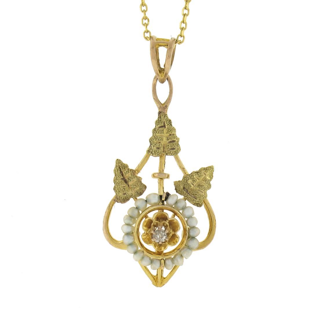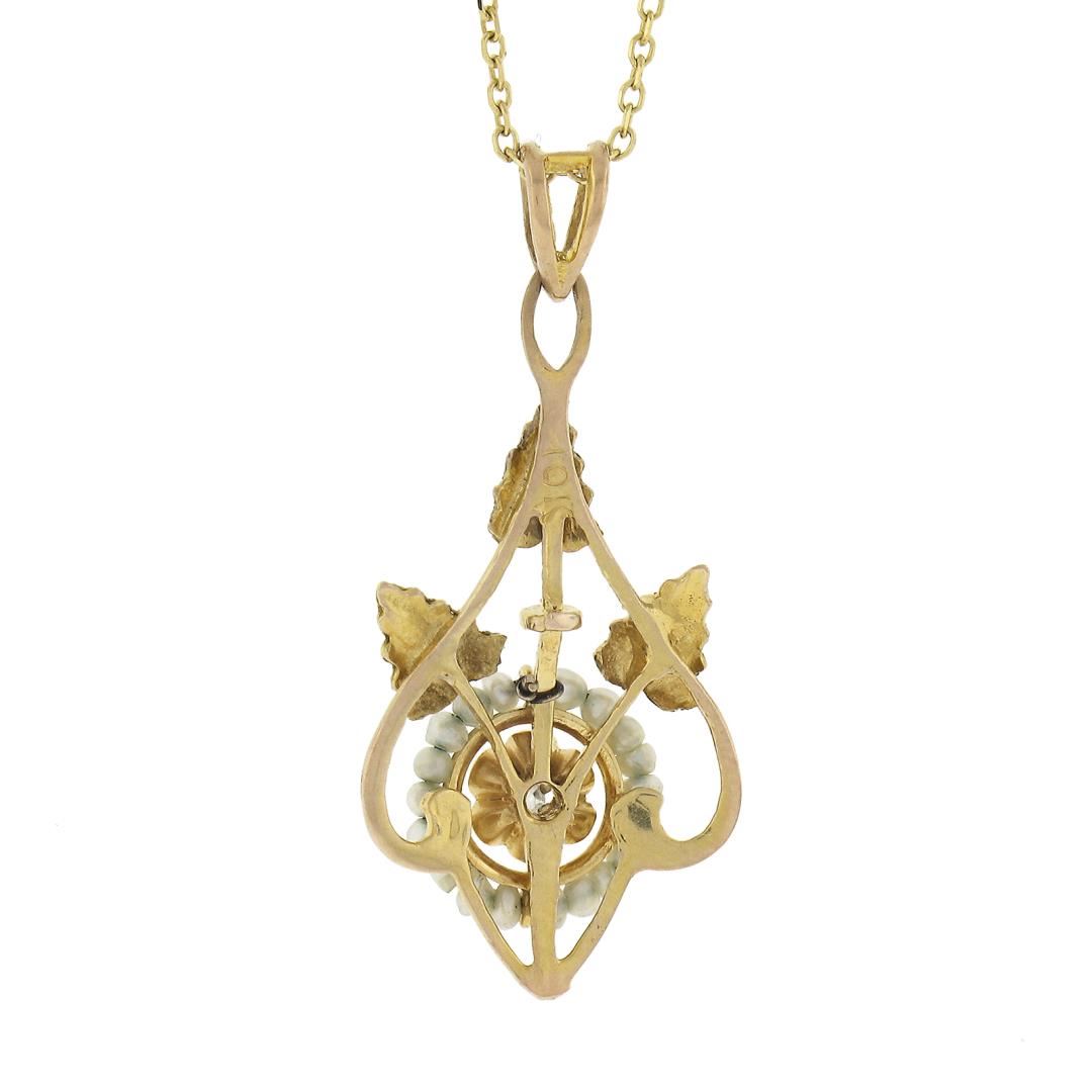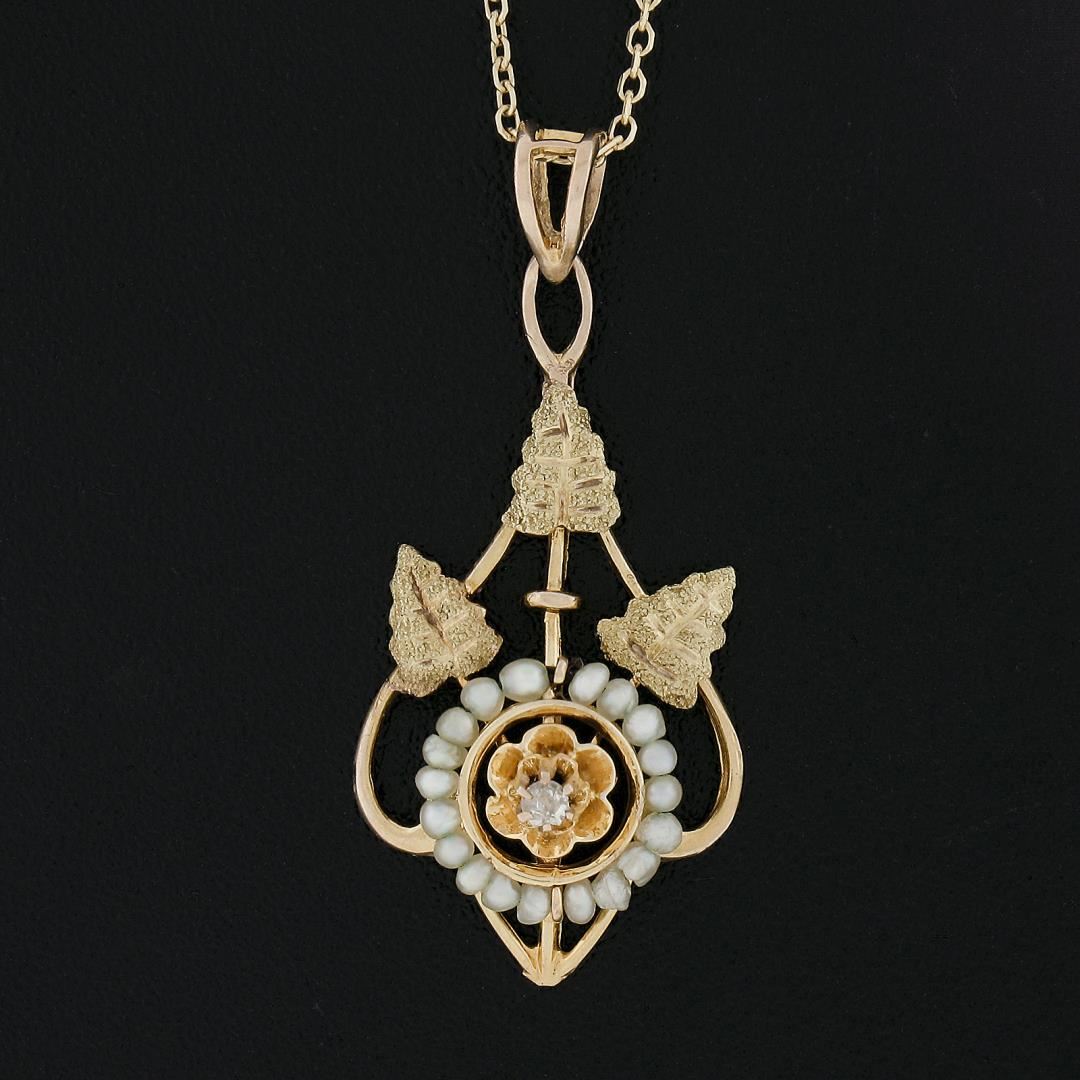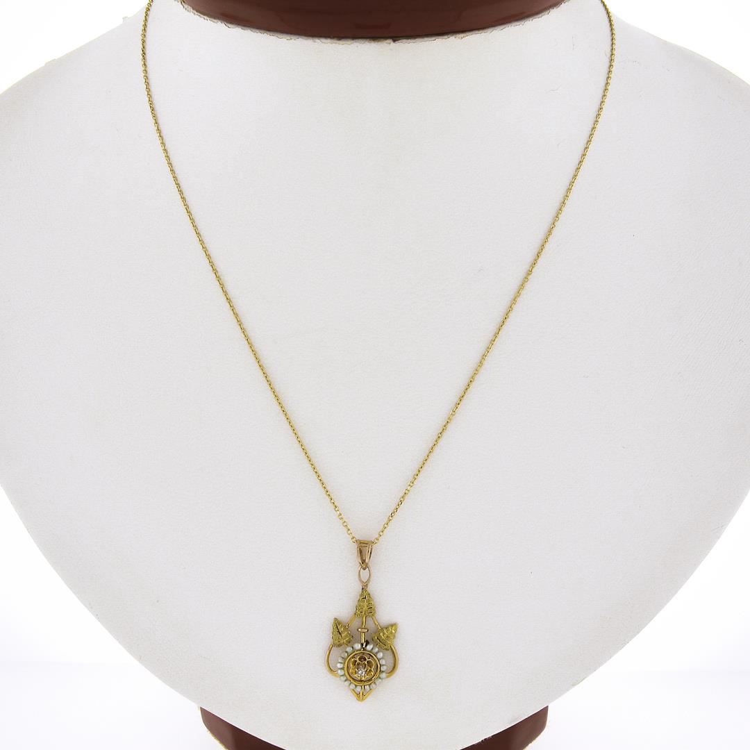 An antique solid 10k yellow gold pendant with 14k yellow gold chain necklace, featurng 1 old single cut natural diamond (H - SI2 ; 0.02ct ), and 19 bead shape cultured seed pearls. 18 inch cable link chain, 2.05 grams total weight, pendant measures 28.3x12.9mm