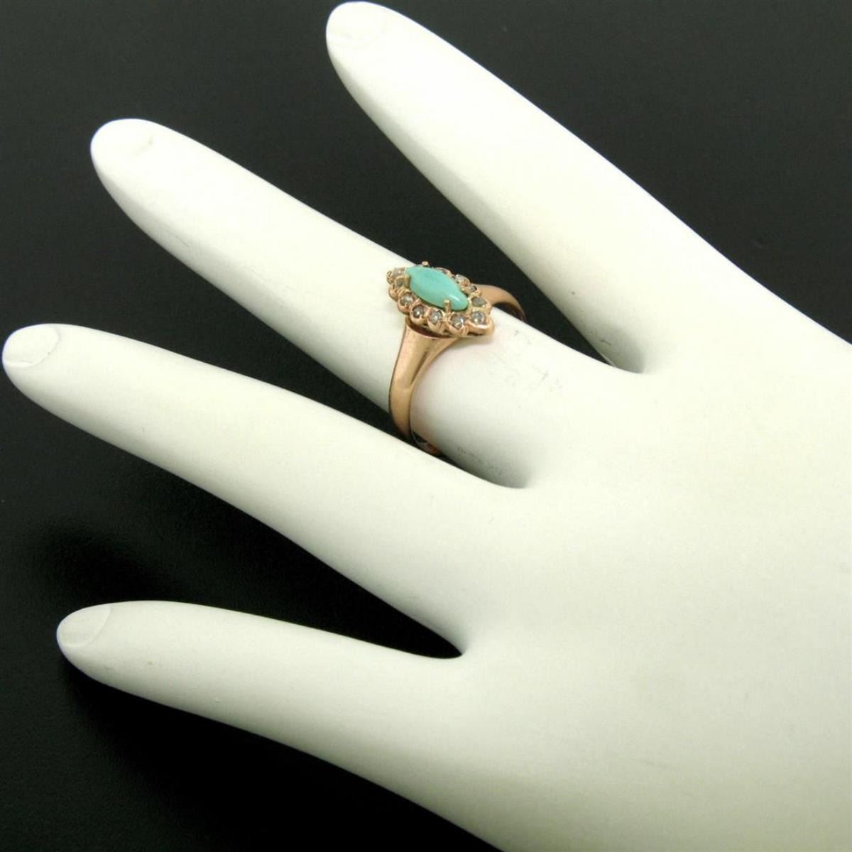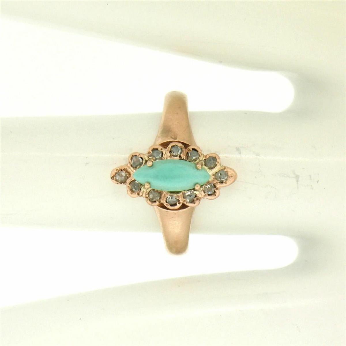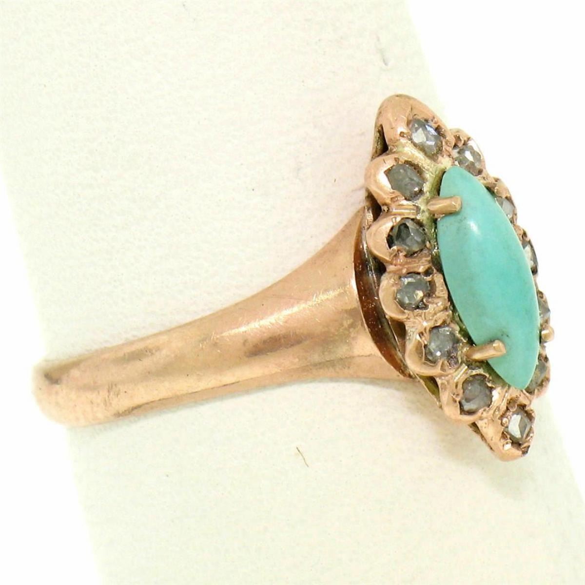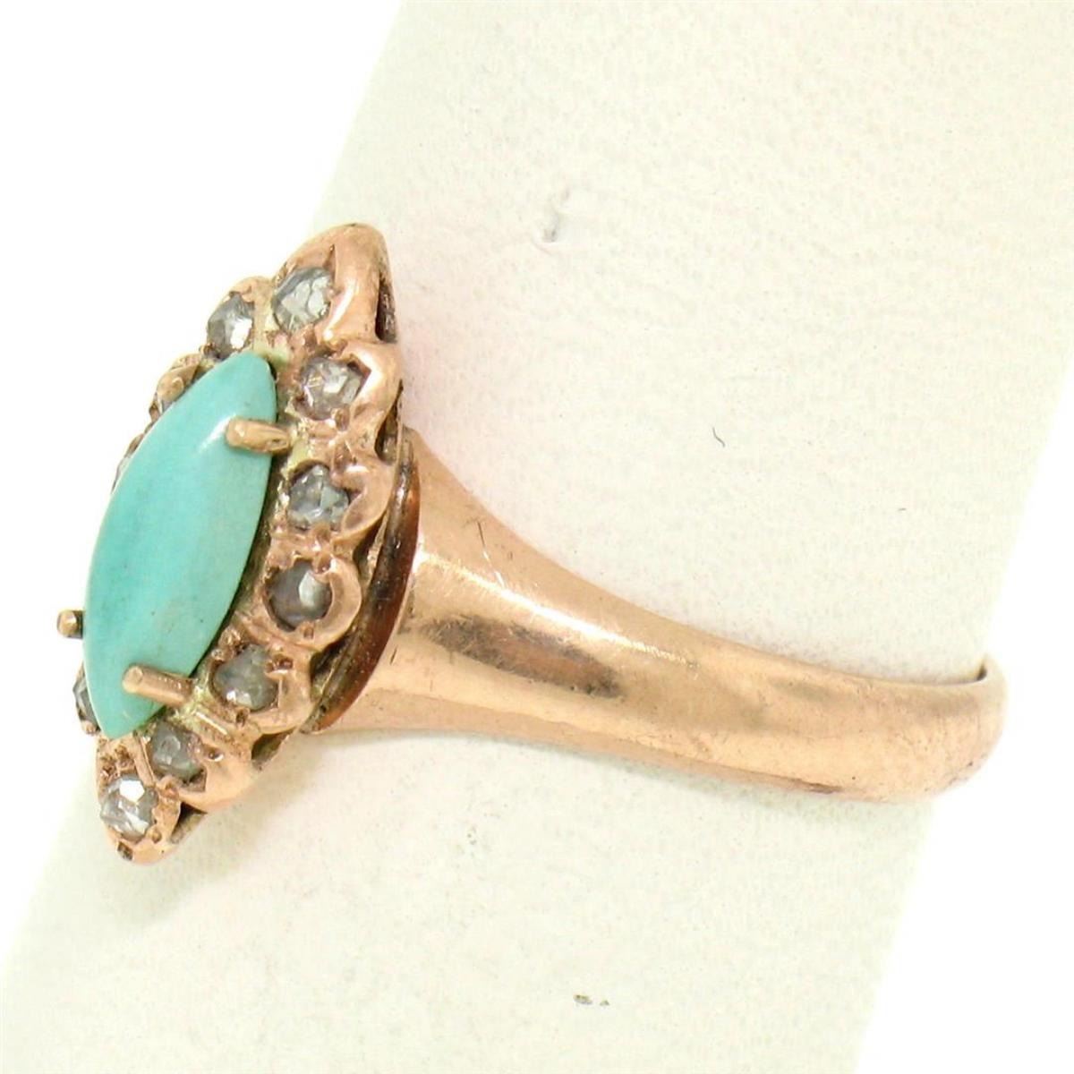 One Antique Victorian 10K Rose Gold Marquise Turquoise .30ctw Diamond Solitaire Ring. Item Details: Material: 10K Rose Gold, Weight: 2.2 Grams, Stone(s): (1) Natural Genuine Turquoise - Marquise Cabochon Cut - Prong Set - Turquoise Blue Color - 8.10x3.41mm, (12) Natural Genuine Diamonds - Rose Cut - Pave Set - H Color - SI1 Clarity - 0.30ctw (approx.), Total Carat Weight: 0.30 (approx.), Ring Size: 5.75 (We can custom size this ring.), Ring Width: 13.53mm, Ring Height: 5.75mm rise off the finger