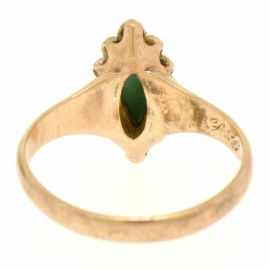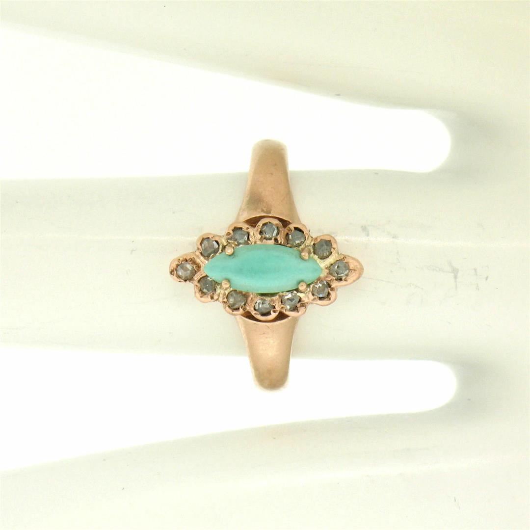 One Antique Victorian 10K Rose Gold Marquise Turquoise .30ctw Diamond Solitaire Ring. Item Details: Material: 10K Rose Gold, Weight: 2.2 Grams, Stone(s): (1) Natural Genuine Turquoise - Marquise Cabochon Cut - Prong Set - Turquoise Blue Color - 8.10x3.41mm, (12) Natural Genuine Diamonds - Rose Cut - Pave Set - H Color - SI1 Clarity - 0.30ctw (approx.), Total Carat Weight: 0.30 (approx.), Ring Size: 5.75 (We can custom size this ring.), Ring Width: 13.53mm, Ring Height: 5.75mm rise off the finger