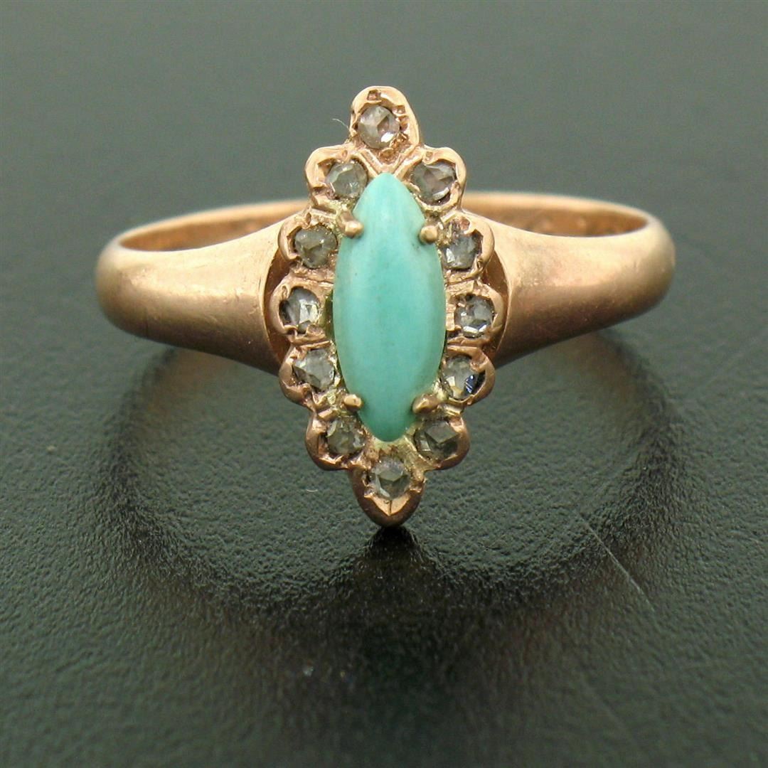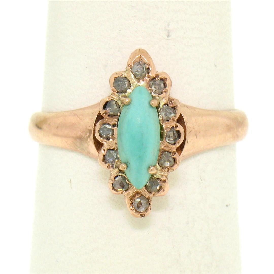 One Antique Victorian 10K Rose Gold Marquise Turquoise .30ctw Diamond Solitaire Ring. Item Details: Material: 10K Rose Gold, Weight: 2.2 Grams, Stone(s): (1) Natural Genuine Turquoise - Marquise Cabochon Cut - Prong Set - Turquoise Blue Color - 8.10x3.41mm, (12) Natural Genuine Diamonds - Rose Cut - Pave Set - H Color - SI1 Clarity - 0.30ctw (approx.), Total Carat Weight: 0.30 (approx.), Ring Size: 5.75 (We can custom size this ring.), Ring Width: 13.53mm, Ring Height: 5.75mm rise off the finger