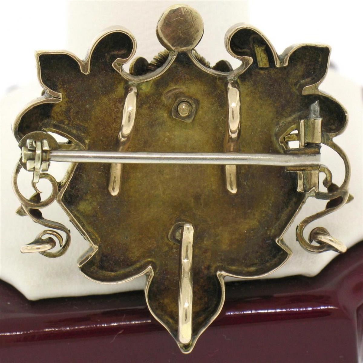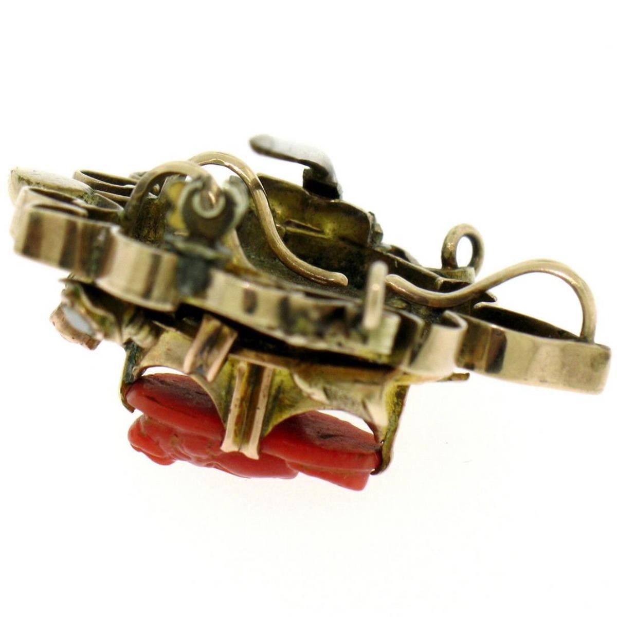 One Antique Victorian 10k Solid Gold Carved OX BLOOD Coral Cameo Seed Pearl Brooch Pendant. Item Details: Material: 10k Solid Yellow Gold, Total Weight: 9.80 Grams, Stone(s): (1) Natural Genuine Coral - Oval Shaped, Hand Carved - Prong Set - Deep, Rich Ox Blood Red Color - 14.00x9.50mm, (3) Natural Seed Pearls - Bead Set - Grayish White Color, Overall Height: 32.70mm, Overall Width: 31.70mm, Backing(s): Pin across the back rotating lock mechanism for wear as a brooch. Dual bail for wear as a pendant which can accommodate up to a 4.20 mm chain., Condition: Antique, all original, EXCELLENT CONDITION w/ original patina.