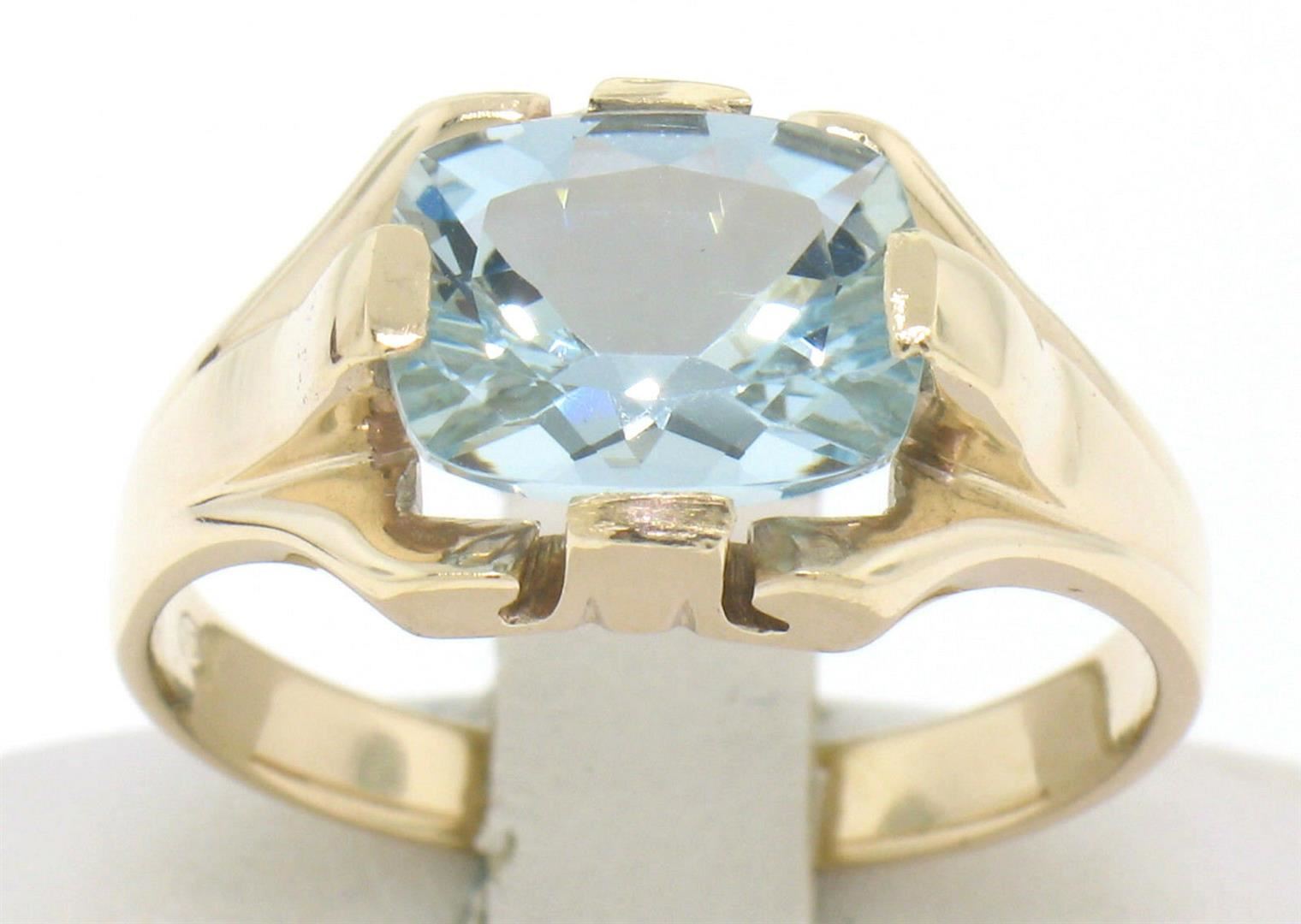 One Vintage 10k Solid Gold Cushion Cut Horizontal Aquamarine Solitaire Ladies Ring. Item Details - Material: Solid 10K Yellow Gold, Weight: 4.80 Grams , Stone(s): (1) Natural Genuine Aquamarine - Cushion Cut - Prong Set - Crystal Clear Light Blue - 10.36x8.16mm - 2.50ct (approx.), Size: 9.0, Dimensions: Measures 11.60mm side to side by 10.23mm top to bottom, Condition: Vintage estate piece in excellent condition.