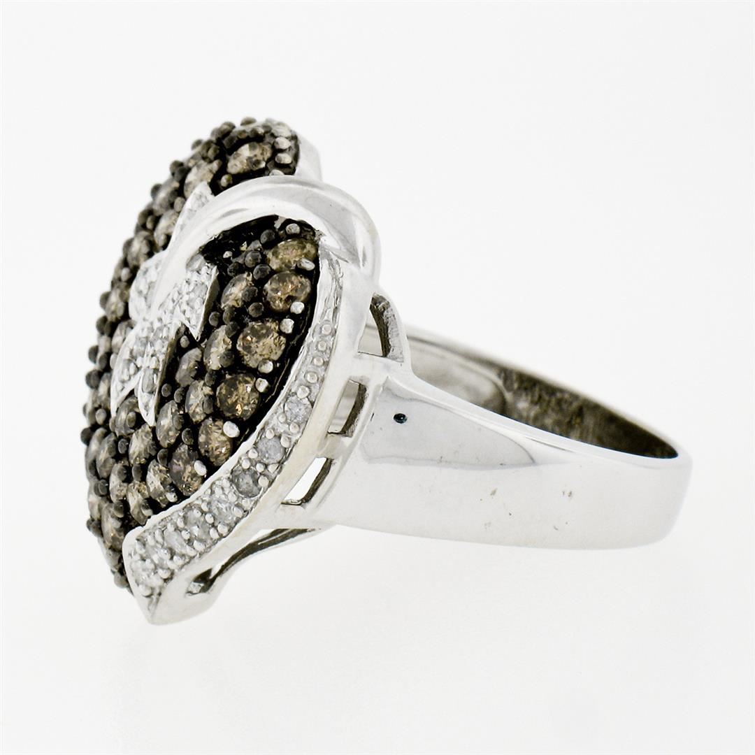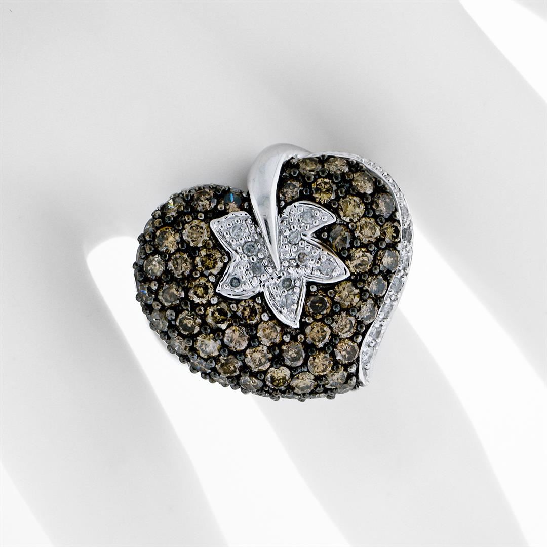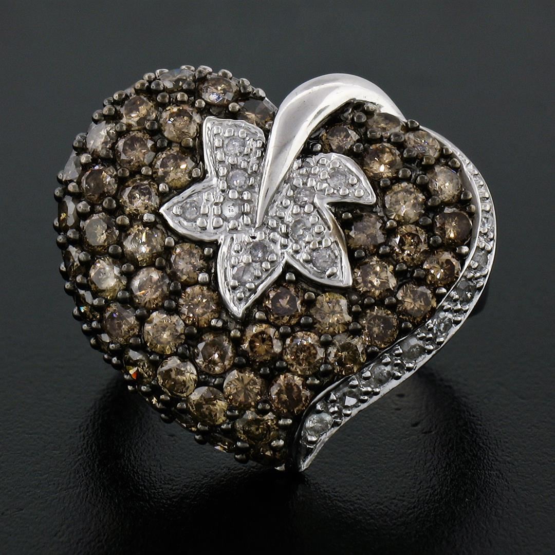 A 10k white gold leaf and heart motif ring with 2.85ctw of prong set round brilliant fancy light brown diamonds (SI2/I1) accented by an additional 0.25ctw of pave set round brilliant white diamonds (H - I1/I2). The ring is size 7.0, weighs a total of 8.28 grams, and measures 21.0mm wide.