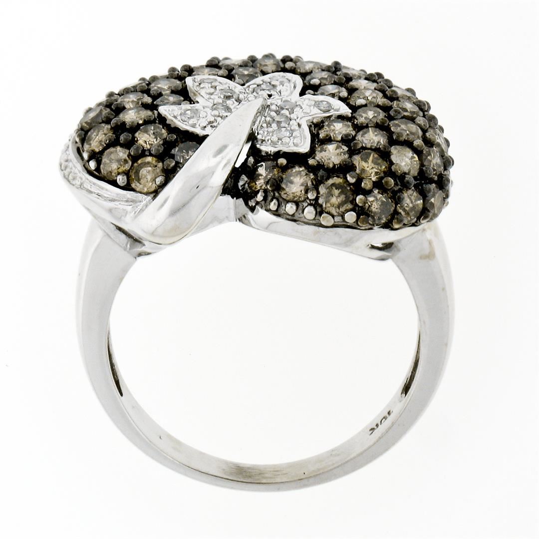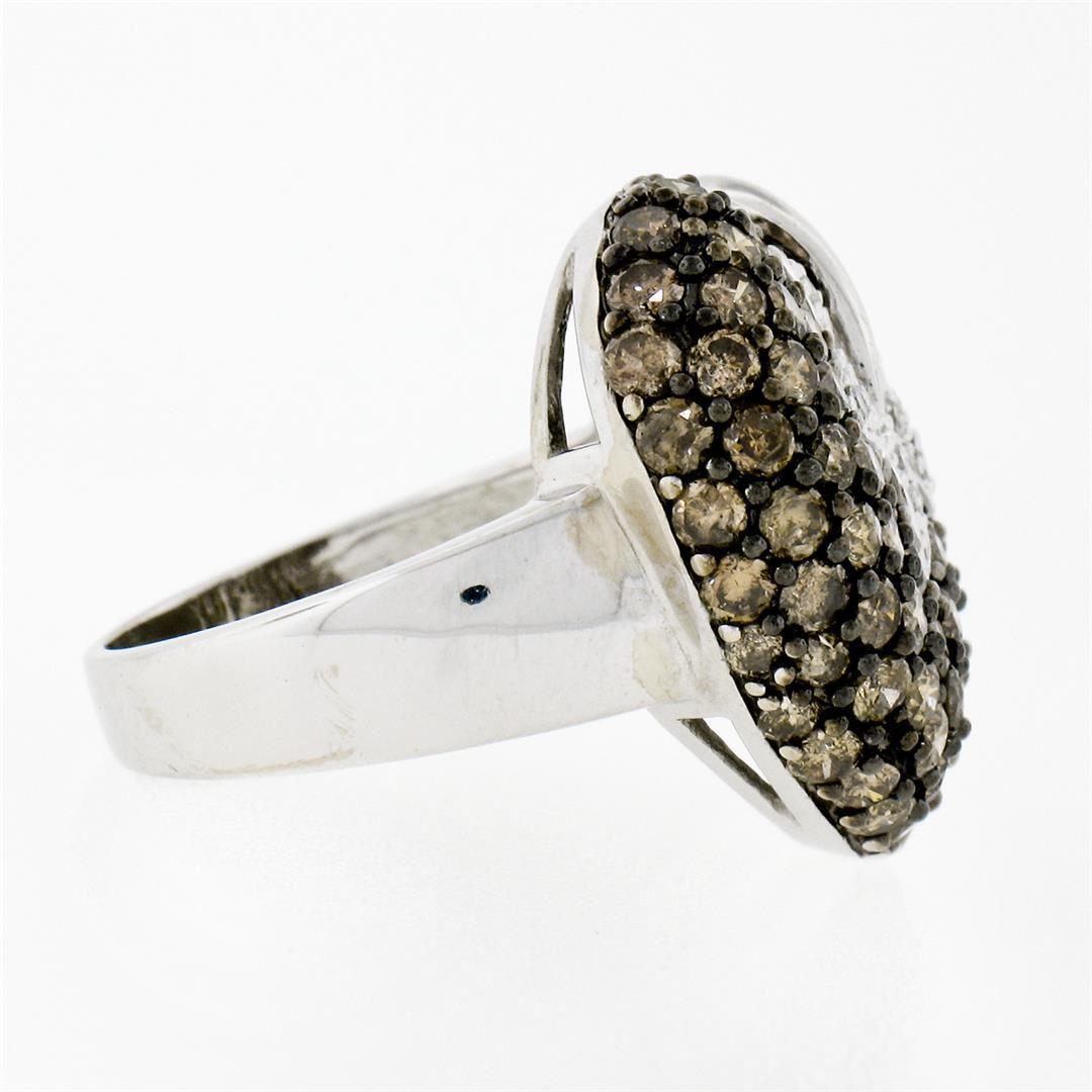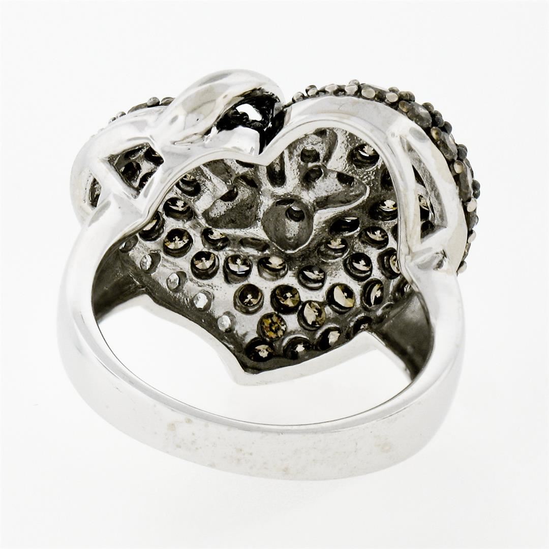 A 10k white gold leaf and heart motif ring with 2.85ctw of prong set round brilliant fancy light brown diamonds (SI2/I1) accented by an additional 0.25ctw of pave set round brilliant white diamonds (H - I1/I2). The ring is size 7.0, weighs a total of 8.28 grams, and measures 21.0mm wide.