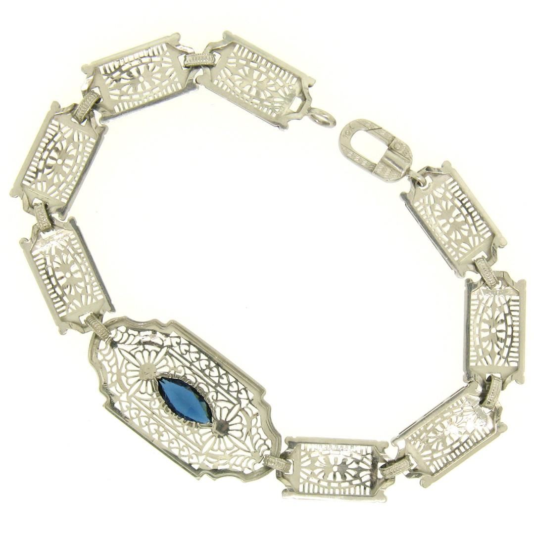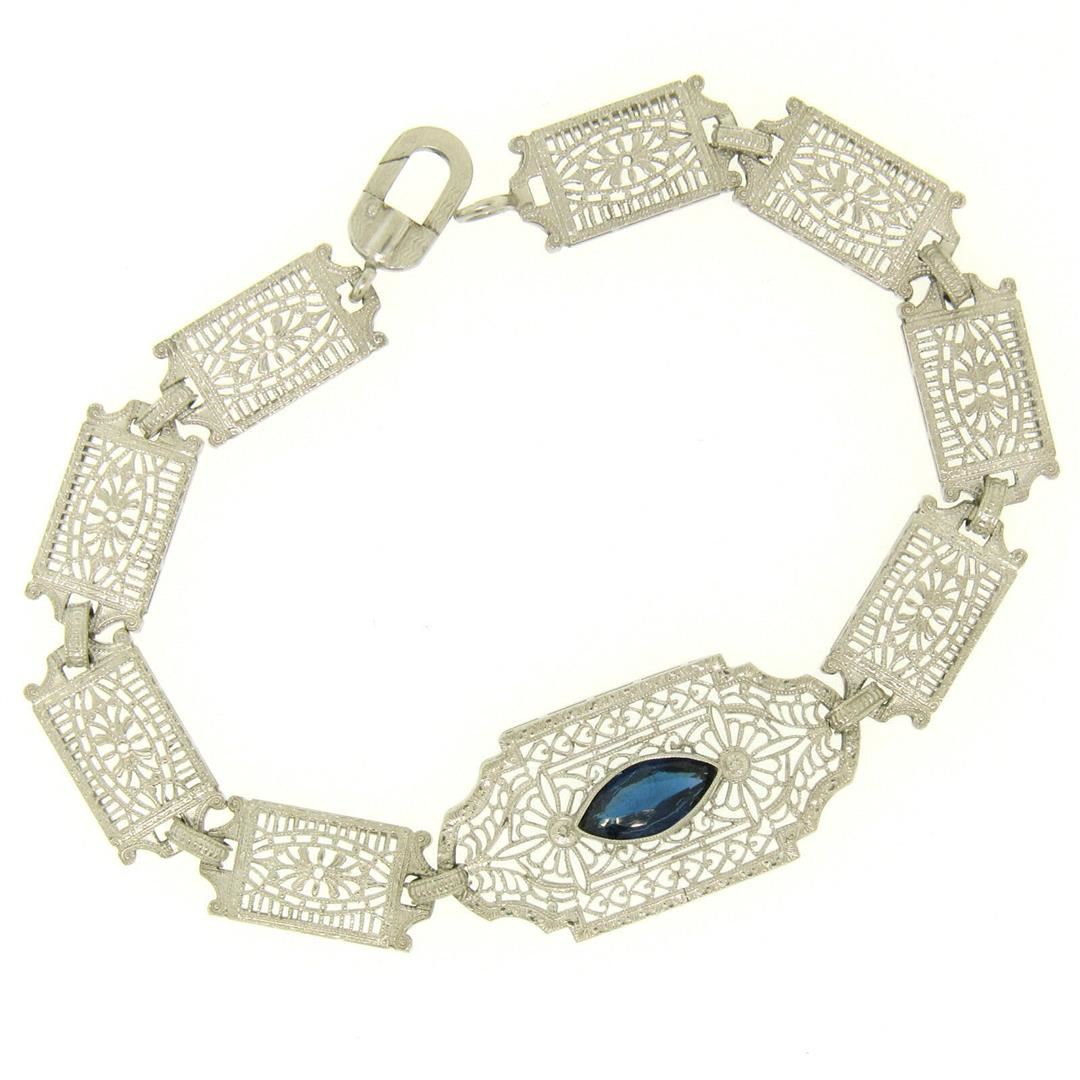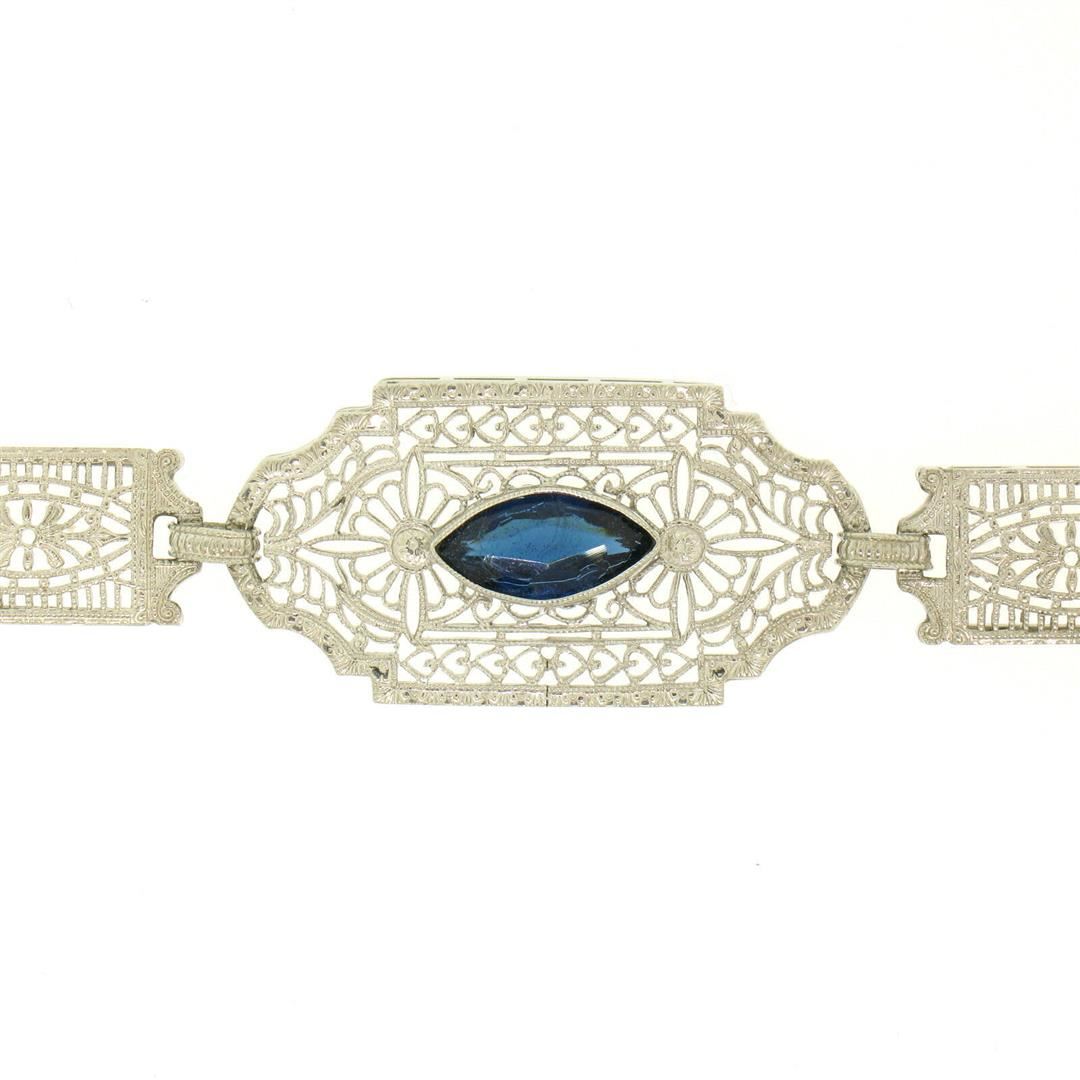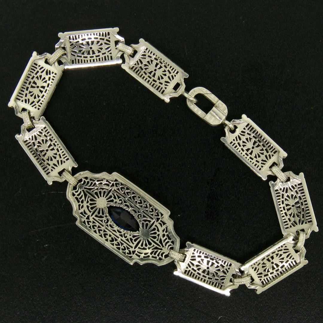 One Antique Edwardian 10k White Gold Filigree Link Bracelet w/ Marquise Sim Sapphire. Item Details: Material: 10k Solid White Gold, Weight: 7.5 Grams, Stone(s): (1) Simulated Sapphire - Marquise Cut - Bezel Set - Beautiful Royal Blue Color - 10.16x5.08mm (approx.), Chain Type: Unique Filigree and Milgrain Link, Chain Length: 7 Inches, Clasp: Lobster-Like Spring Loaded Push Clasp, Width: 15.20mm at the center link, Thickness: 4.05mm rise off the wrist, Condition: Antique, Edwardian era piece. Excellent condition!