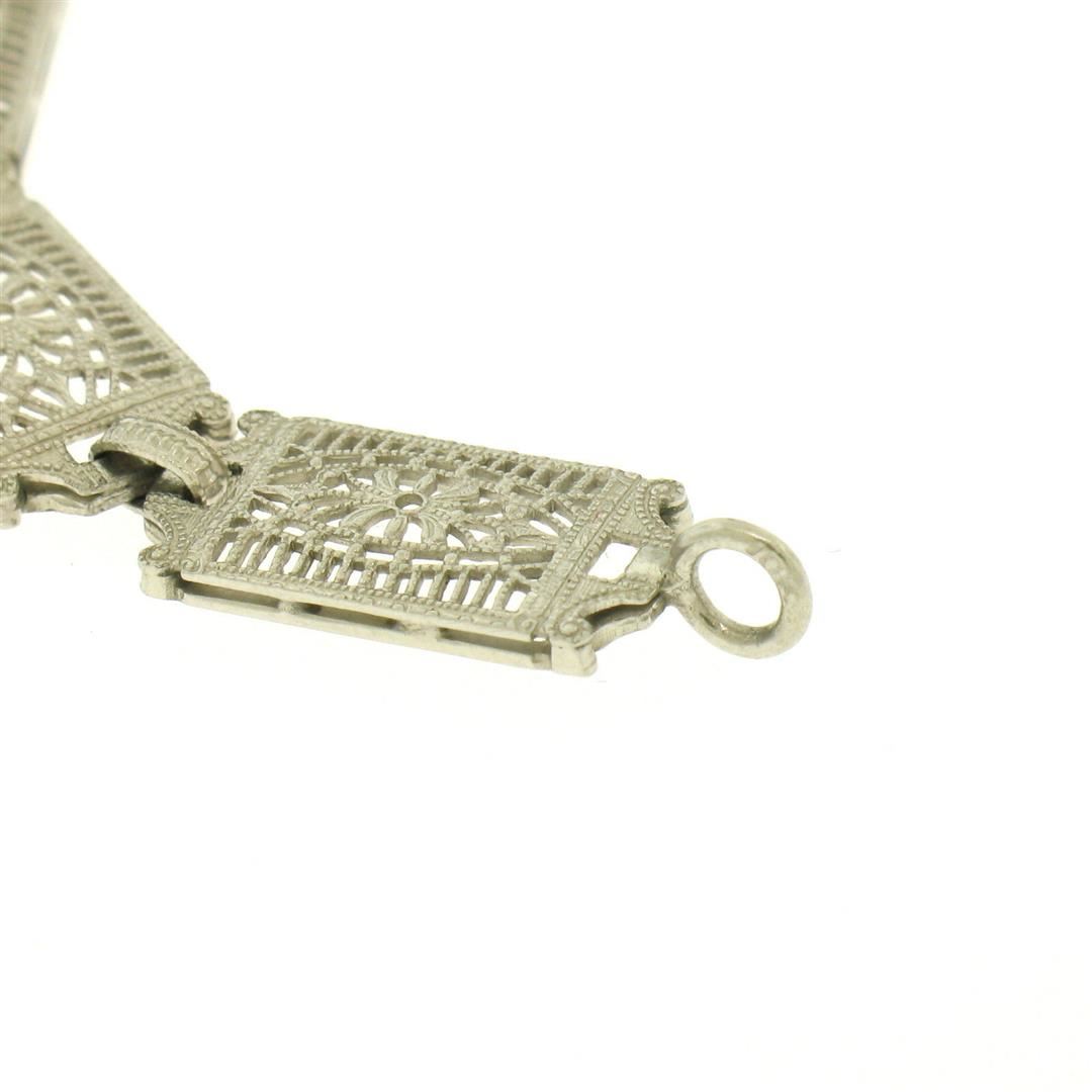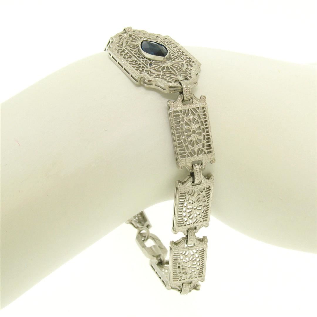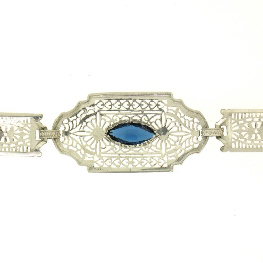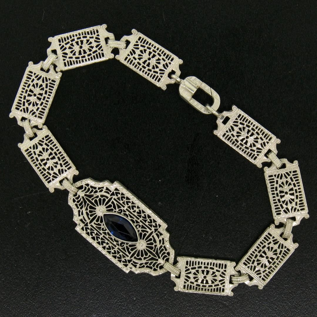 One Antique Edwardian 10k White Gold Filigree Link Bracelet w/ Marquise Sim Sapphire. Item Details: Material: 10k Solid White Gold, Weight: 7.5 Grams, Stone(s): (1) Simulated Sapphire - Marquise Cut - Bezel Set - Beautiful Royal Blue Color - 10.16x5.08mm (approx.), Chain Type: Unique Filigree and Milgrain Link, Chain Length: 7 Inches, Clasp: Lobster-Like Spring Loaded Push Clasp, Width: 15.20mm at the center link, Thickness: 4.05mm rise off the wrist, Condition: Antique, Edwardian era piece. Excellent condition!