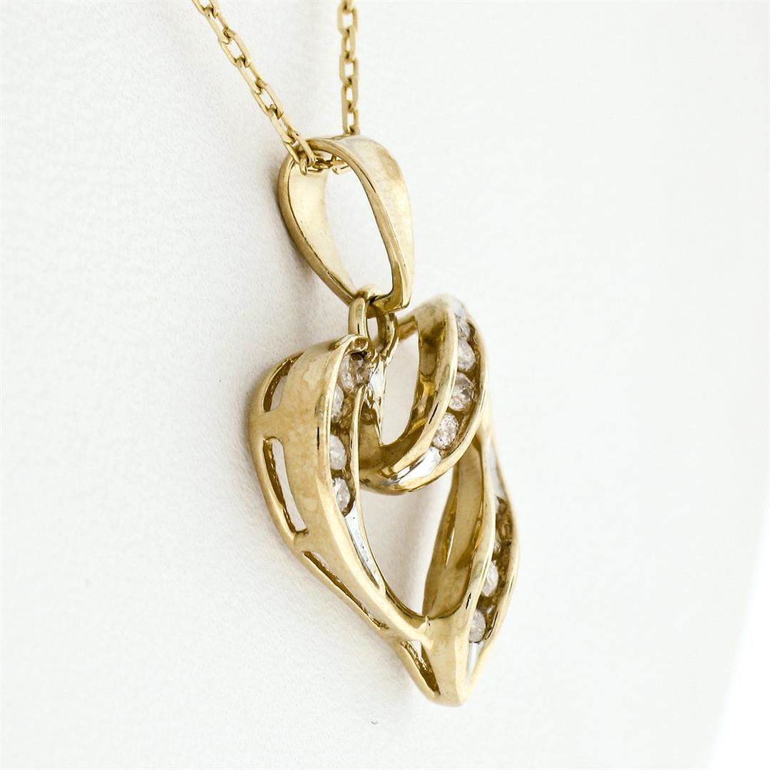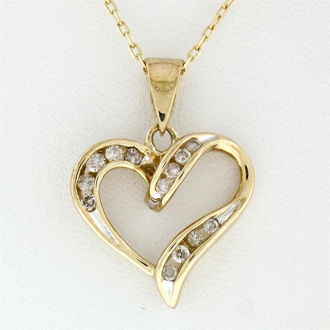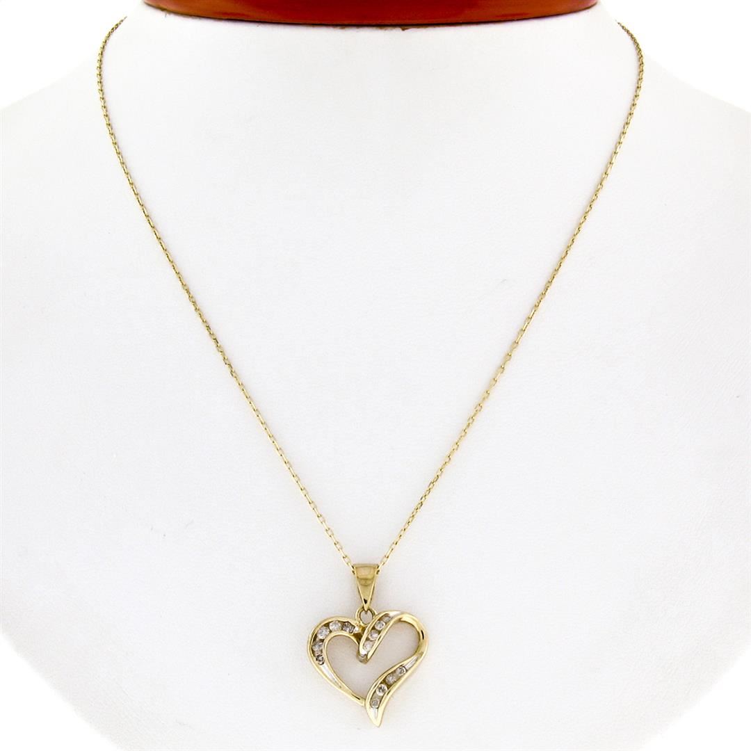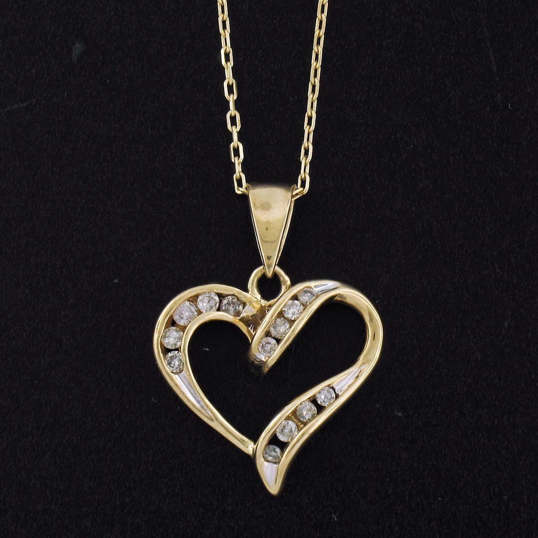 A 10k yellow gold open heart pendant necklace featuring 13 channel set round brilliant diamonds (I - I1/I2; 0.26ctw). 16 inch 14k yellow gold cable link chain, 3.75 grams total weight, pendant measures 17.8x17.8mm.