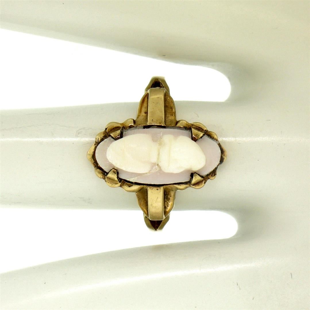 One Antique Victorian 10k Yellow Gold Simple Petite Carved Pink Stone Cameo Ring. Item Details: Material: Solid 10k Yellow Gold, Weight: 3.2 Grams, Stone(s): (1) Genuine Carved Stone Cameo - Oval Cut - Prong Set - White Carving on Pale Pink Field, Ring Size: 6.5 (We can custom size this ring.), Ring Width: 16.99mm, Ring Height: 5.84mm rise off the finger, Condition: Antique, Victorian era piece. Cameo appears to have been repaired at one point. Great overall condition and 100% ready to wear.
