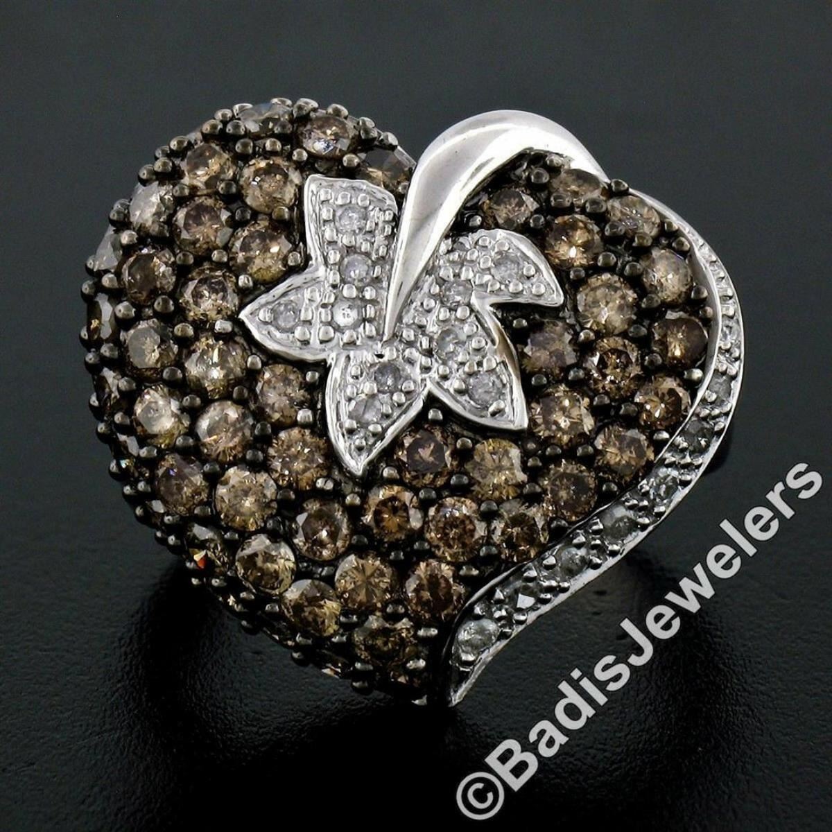 A 10kt white gold leaf and heart motif ring with 2.85ctw of prong set round brilliant fancy light brown diamonds (SI2/I1) accented by an additional 0.25ctw of pave set round brilliant white diamonds (H - I1/I2). The ring is size 7.0, weighs a total of 8.28 grams, and measures 21.0mm wide.