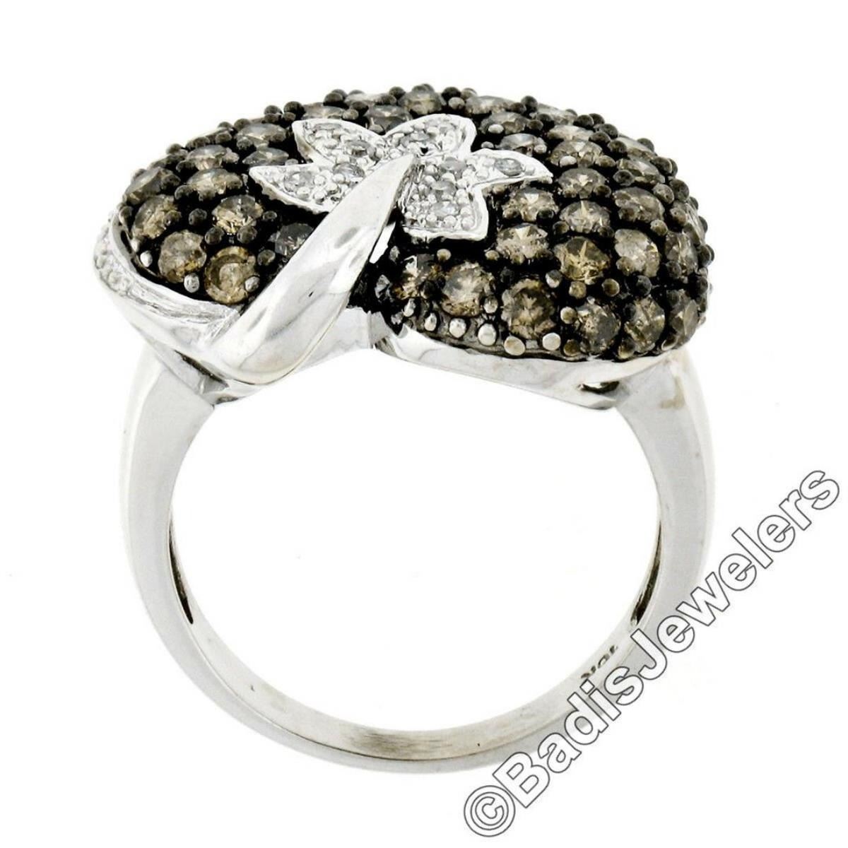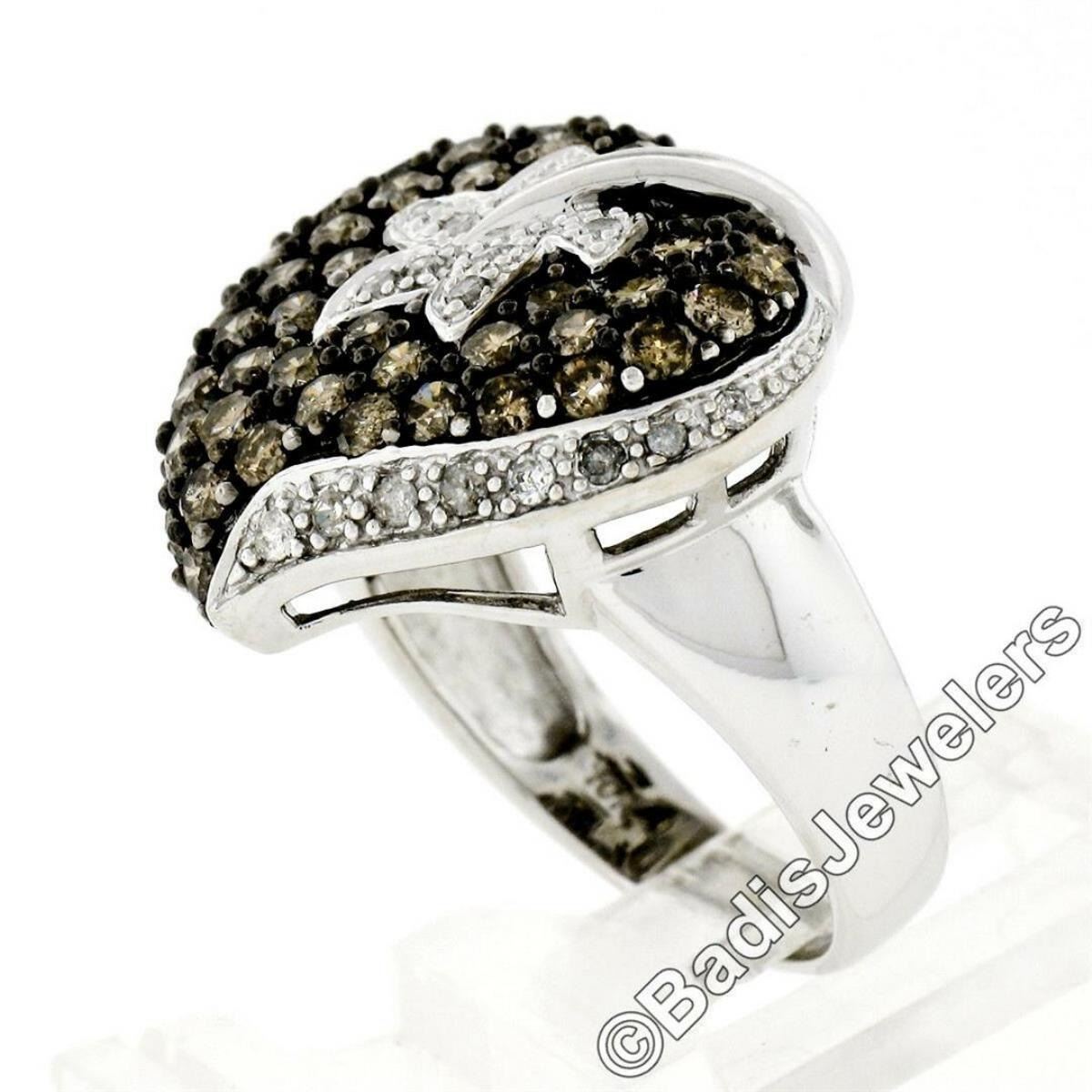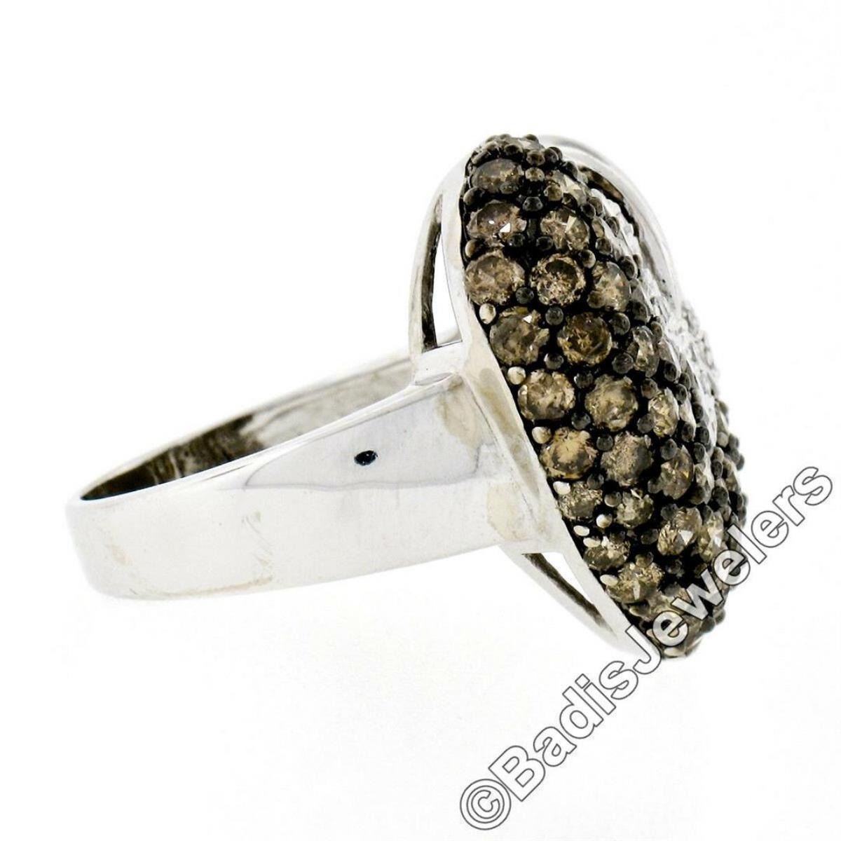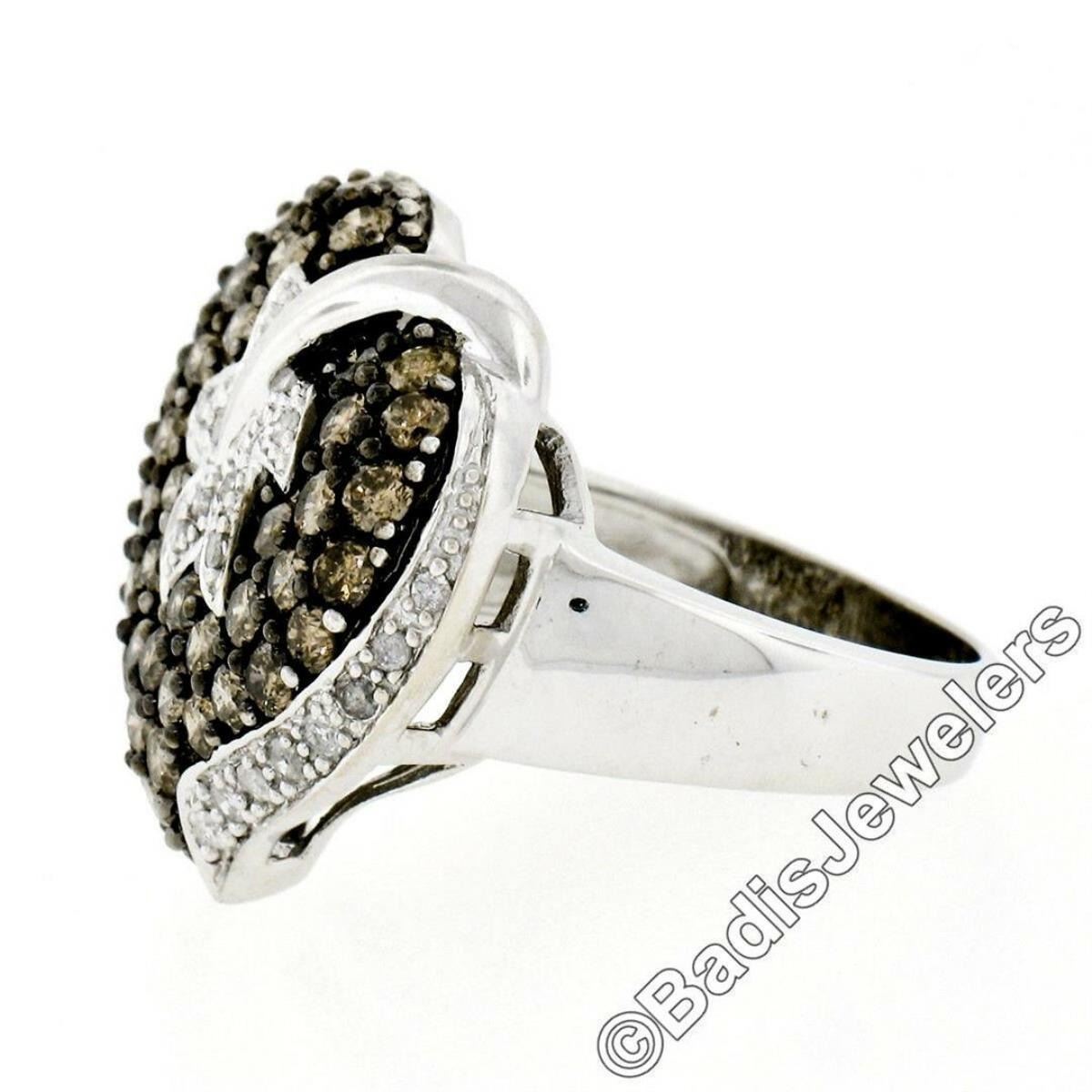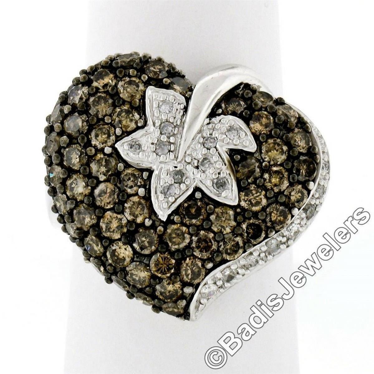 A 10kt white gold leaf and heart motif ring with 2.85ctw of prong set round brilliant fancy light brown diamonds (SI2/I1) accented by an additional 0.25ctw of pave set round brilliant white diamonds (H - I1/I2). The ring is size 7.0, weighs a total of 8.28 grams, and measures 21.0mm wide.