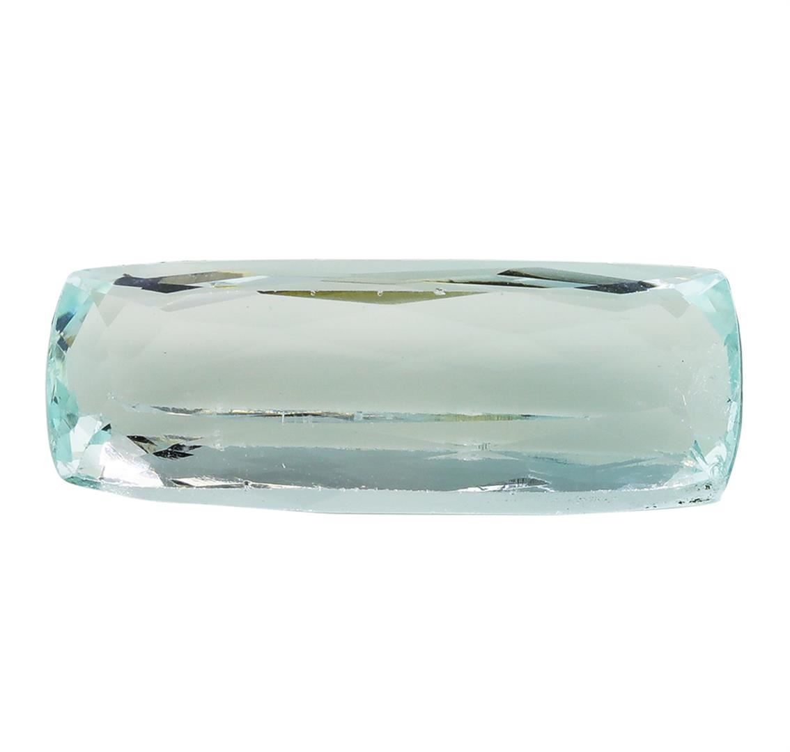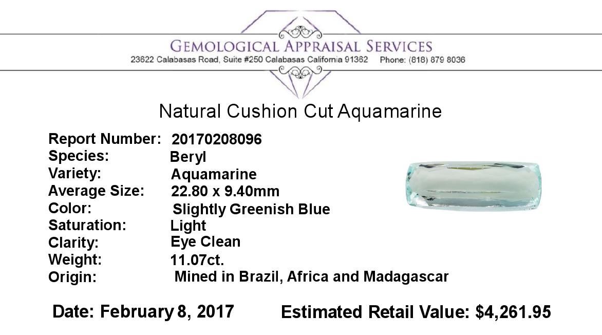 One natural cushion cut aquamarine with an exact weight of 11.07ct., clarity is eye clean, slightly greenish blue, light. Gemological Appraisals Services estimates the retail value at $4261.95 GAS Appraised.