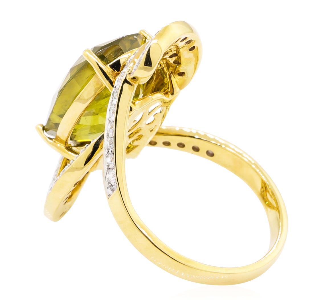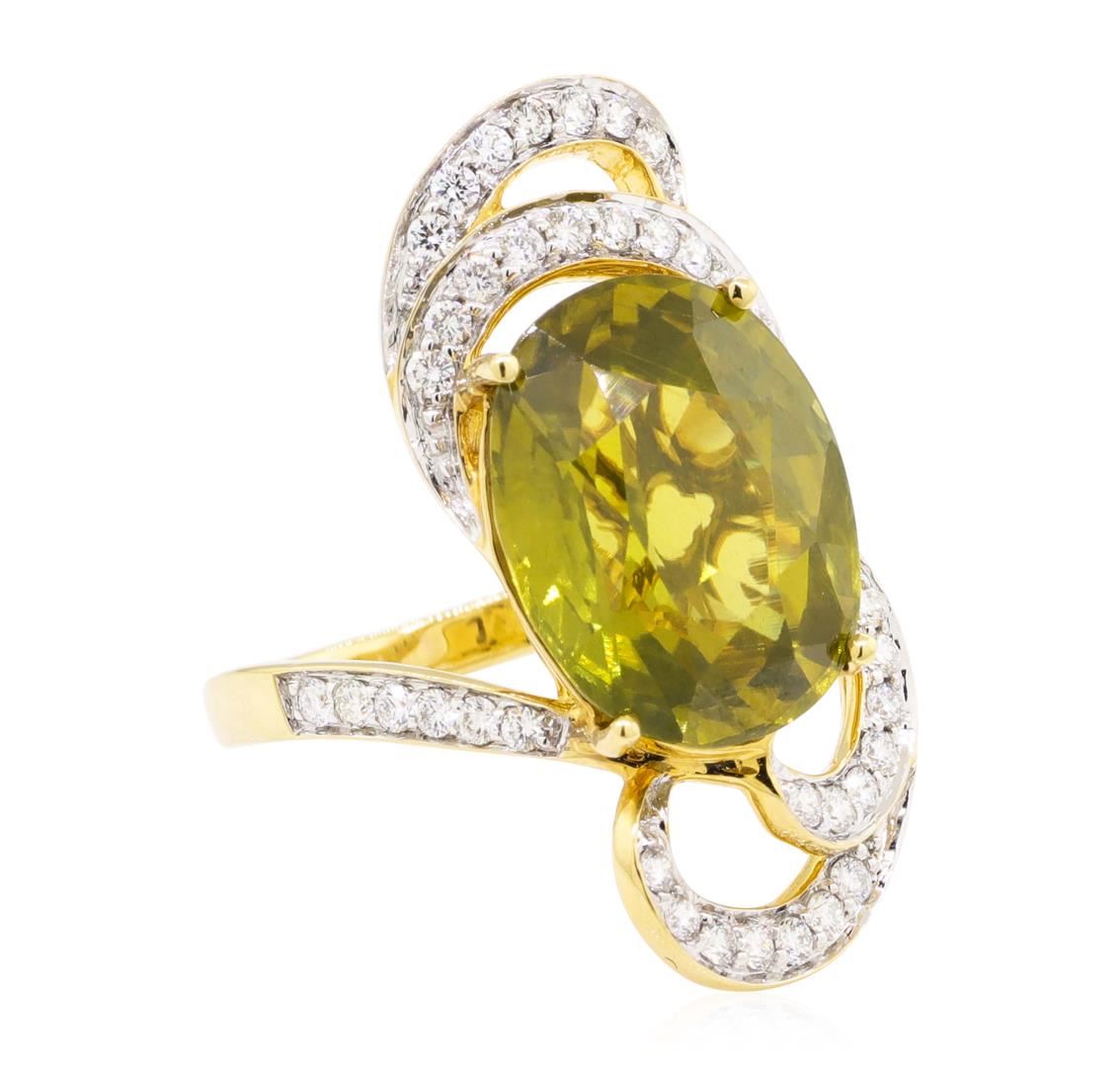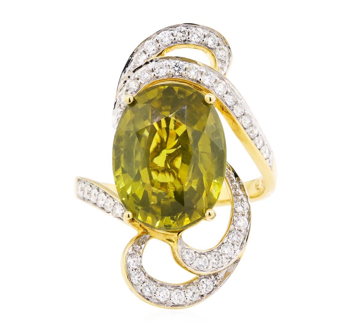 One electronically tested 18KT yellow gold lady's cast fashion ring with a bypass swirl with a bright polish finish. The featured lady's ring has a shank measuring 2.15 millimeters wide. Identified with markings of '18K'. Condition is new, good workmanship. Containing: One prong set oval modified mixed cut natural green zircon, measuring 14.22 x 10.90 x 6.90mm, (depth est.) approximate weight of 10.60ct., clarity is moderately included, medium dark, slightly grayish, strongly yellowish green color, (GIA styG 6/2), cut is good. Transmitting light somewhat diffusely, transparent to translucent. Colored gemstones are presumed to have been subjected to commonly used enhancement processes. Graded in the setting. Forty bead set round brilliant cut diamonds, measuring 1.60 - 1.40 x 0.93mm (depth est.) approximate total weight of 40 Stones = 0.50ct. Graded in the setting. Color G - H Clarity VS-2 to SI-1 Cut Very Good. Total Weight of Colored Stones 10.60ct.. Total Weight of Diamonds 0.50ct.. Total Weight of Ring 8.10gm GAS Appraised at $6640.00. GAS Appraised.