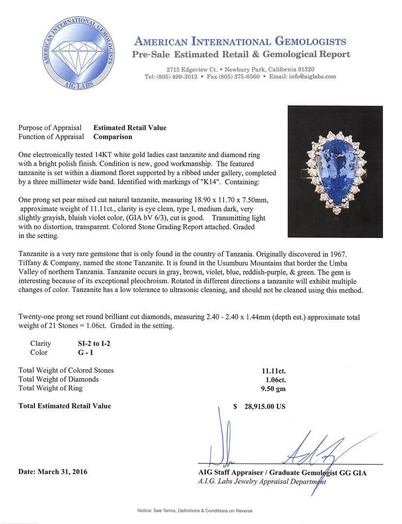 One electronically tested 14KT white gold ladies cast tanzanite and diamond ring with a bright polish finish. The featured tanzanite is set within a diamond floret supported by a ribbed under gallery, completed by a three millimeter wide band. Identified with markings of "K14". Condition is new, good workmanship. Containing: One prong set pear mixed cut natural tanzanite, measuring 18.90 x 11.70 x 7.50mm, approximate weight of 11.11ct., clarity is eye clean, type I, medium dark, very slightly grayish, bluish violet color, (GIA bV 6/3), cut is good. Transmitting light with no distortion, transparent. Colored Stone Grading Report attached. Graded in the setting. Tanzanite is a very rare gemstone that is only found in the country of Tanzania. Originally discovered in 1967. Tiffany & Company, named the stone Tanzanite. It is found in the Usumburu Mountains that border the Umba Valley of northern Tanzania. Tanzanite occurs in gray, brown, violet, blue, reddish-purple, & green. The gem is interesting because of its exceptional pleochroism. Rotated in different directions a tanzanite will exhibit multiple changes of color. Tanzanite has a low tolerance to ultrasonic cleaning, and should not be cleaned using this method. Twenty-One prong set round brilliant cut diamonds, measuring 2.40 - 2.40 x 1.44mm (depth est.) approximate total weight of 21 Stones = 1.06ct. Graded in the setting. Clarity: SI-2 to I-2. Color: G - I. Total Weight of Colored Stones 11.11ct. Total Weight of Diamonds 1.06ct. Total Weight of Ring 9.50gm. AIG Appraised.