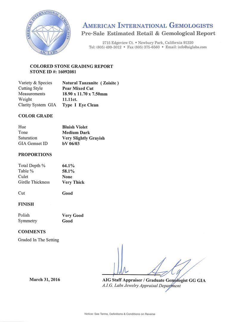 One electronically tested 14KT white gold ladies cast tanzanite and diamond ring with a bright polish finish. The featured tanzanite is set within a diamond floret supported by a ribbed under gallery, completed by a three millimeter wide band. Identified with markings of "K14". Condition is new, good workmanship. Containing: One prong set pear mixed cut natural tanzanite, measuring 18.90 x 11.70 x 7.50mm, approximate weight of 11.11ct., clarity is eye clean, type I, medium dark, very slightly grayish, bluish violet color, (GIA bV 6/3), cut is good. Transmitting light with no distortion, transparent. Colored Stone Grading Report attached. Graded in the setting. Tanzanite is a very rare gemstone that is only found in the country of Tanzania. Originally discovered in 1967. Tiffany & Company, named the stone Tanzanite. It is found in the Usumburu Mountains that border the Umba Valley of northern Tanzania. Tanzanite occurs in gray, brown, violet, blue, reddish-purple, & green. The gem is interesting because of its exceptional pleochroism. Rotated in different directions a tanzanite will exhibit multiple changes of color. Tanzanite has a low tolerance to ultrasonic cleaning, and should not be cleaned using this method. Twenty-One prong set round brilliant cut diamonds, measuring 2.40 - 2.40 x 1.44mm (depth est.) approximate total weight of 21 Stones = 1.06ct. Graded in the setting. Clarity: SI-2 to I-2. Color: G - I. Total Weight of Colored Stones 11.11ct. Total Weight of Diamonds 1.06ct. Total Weight of Ring 9.50gm. AIG Appraised.