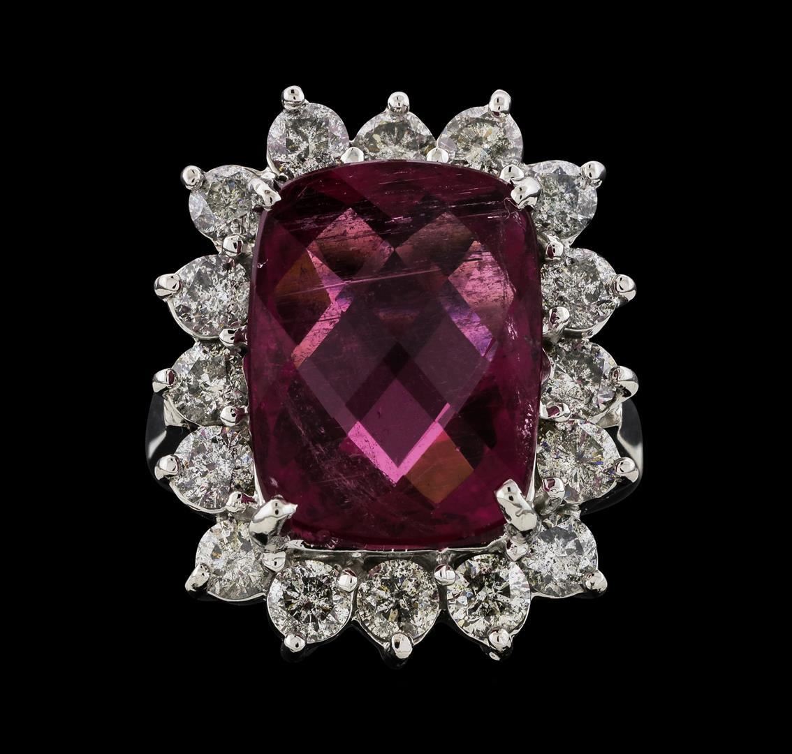 One 14KT White Gold "One of a Kind" Lady's Ring, 11.40 grams. Containing: Main Gemstones: Identity: Natural Tourmaline. Carat Weight: 11.12 cts tw. Shape & Measurement: Cushion Checker Cut. Quality: Fine color and cutting. Adjacent Gemstones: Identity: Natural Diamonds. Shape: Round Brilliant Cut. Carat Weight: 2.37 cts tw. Quality: SI Clarity, G-H Color. All fine cutting and proportions. Total Gemstones Weight: 13.49 cts tw. RBGS Appraised.