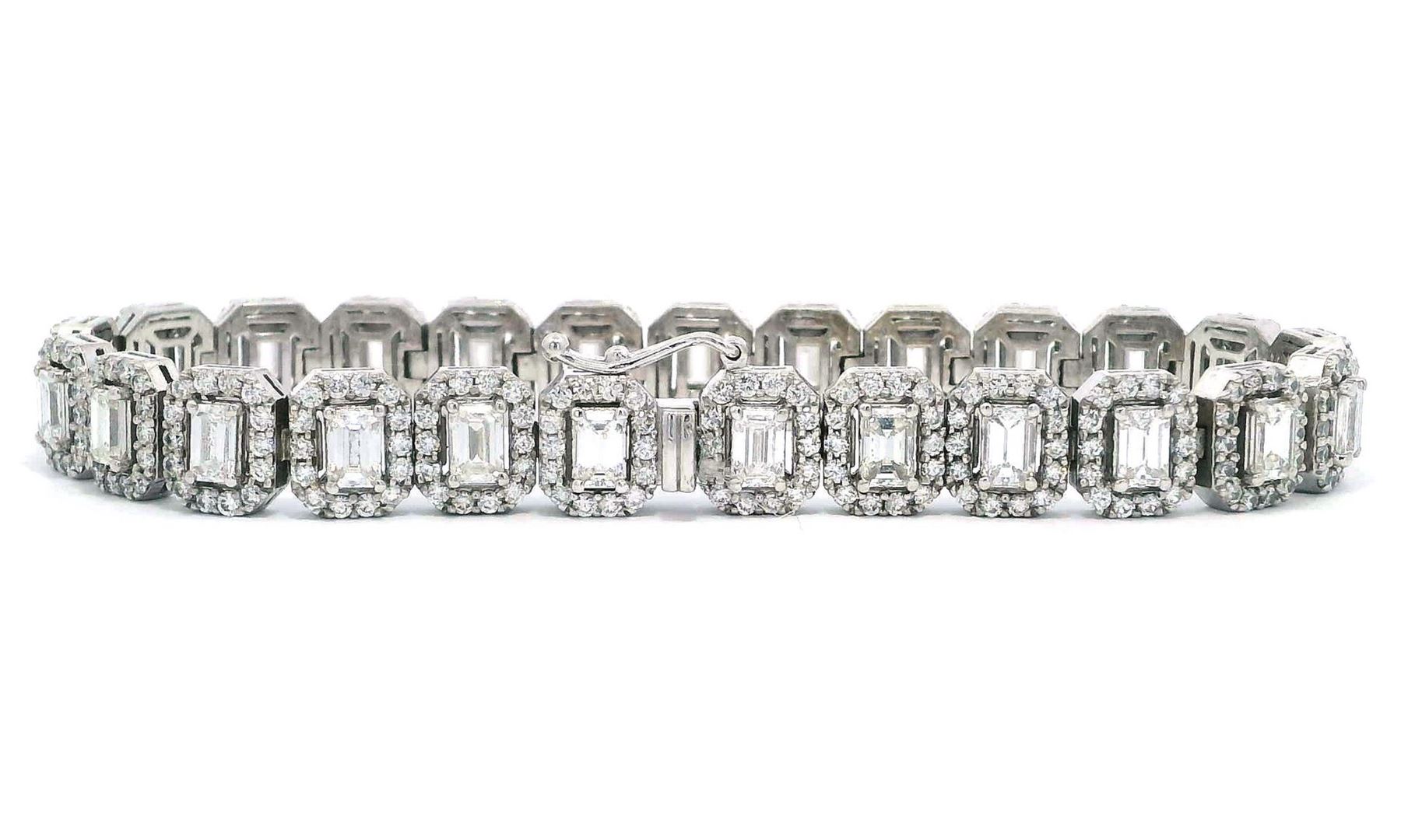 This bracelet features 25 emerald cut diamonds totaling 6.15ct with VS-1 to VS-2 clarity and G-H color, surrounded by 350 round brilliant diamonds totaling 5.00ct. A stunning tennis bracelet design! One electronically tested 14KT white gold lady's combination cast & assembled diamond tennis bracelet with a tongue clasp & fold over safety with an emerald cut motif with a bright polish finish. Condition is new, good workmanship. The featured lady's bracelet measures 7 inches in length. Identified with markings of 14K. Containing: Twenty-five prong set emerald cut diamonds, measuring 4.32 x 2.98 x 1.98mm (depth est.), approximate total weight of 25 Stones = 6.15ct. Graded in the setting. Color: G-H Clarity: VS-1 to VS-2 Cut: Excellent Three hundred fifty prong set round brilliant cut diamonds, measuring 1.60 - 1.55 x 0.95mm (depth est.), approximate total weight of 350 Stones = 5.00ct. Graded in the setting. Color: G-I Clarity: VS-1 to SI-1 Cut: Very Good Total Weight of Diamonds: 11.15ct. Total Weight of Tennis Bracelet: 24.60gm Total Estimated Retail Value: $52500.00 Appraisal No: 000024088010