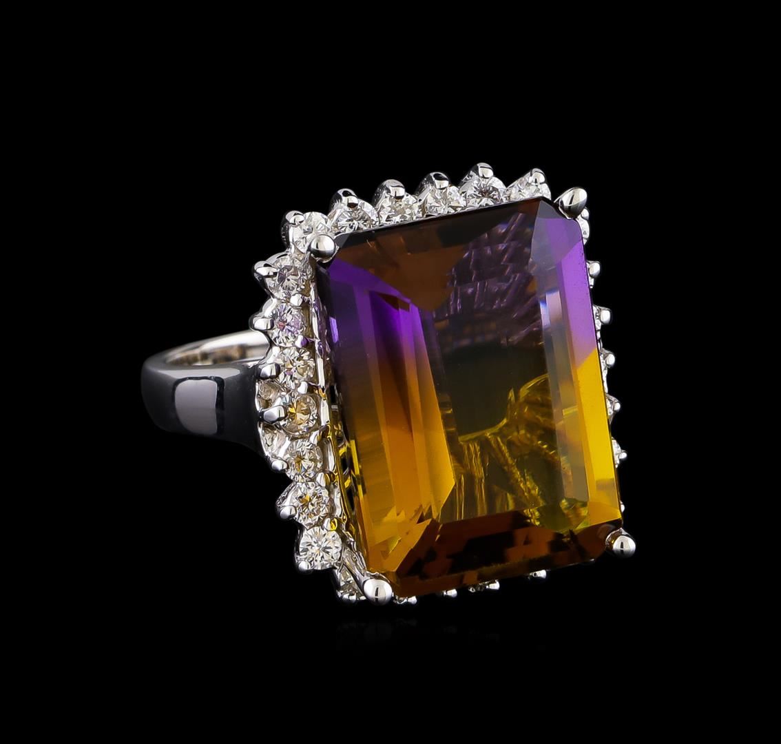 One electronically tested 14KT white gold lady's cast fashion ring with a basket halo with a bright polish finish. The featured lady's ring has a shank measuring 2.76 millimeters in width. Identified with markings of "14K". Condition is new, good workmanship. Containing: One prong set emerald step cut natural ametrine quartz, measuring 16.25 x 12.24 x 7.63mm, (depth est.) 2%. bulge factor, approximate weight of 11.18ct., clarity is eye clean, medium, moderately strong, purple color, (GIA P 5/4) to medium, moderately strong, yellowish orange, (GIA yO 5/4), cut is very good. Transmitting light with no distortion, transparent. Colored gemstones are presumed to have been subjected to commonly used enhancement processes. Graded in the setting. Twenty-Six prong set round brilliant cut diamonds, measuring 2.00 - 1.90 x 1.21mm (depth est.) approximate total weight of 26 Stones = 0.72ct. Graded in the setting. Clarity: SI-1 to SI-2. Color: H - I. Cut Good. Total Weight of Colored Stones 11.18ct. Total Weight of Diamonds 0.72ct. Total Weight of Ring 8.40gm. GAS Appraised.