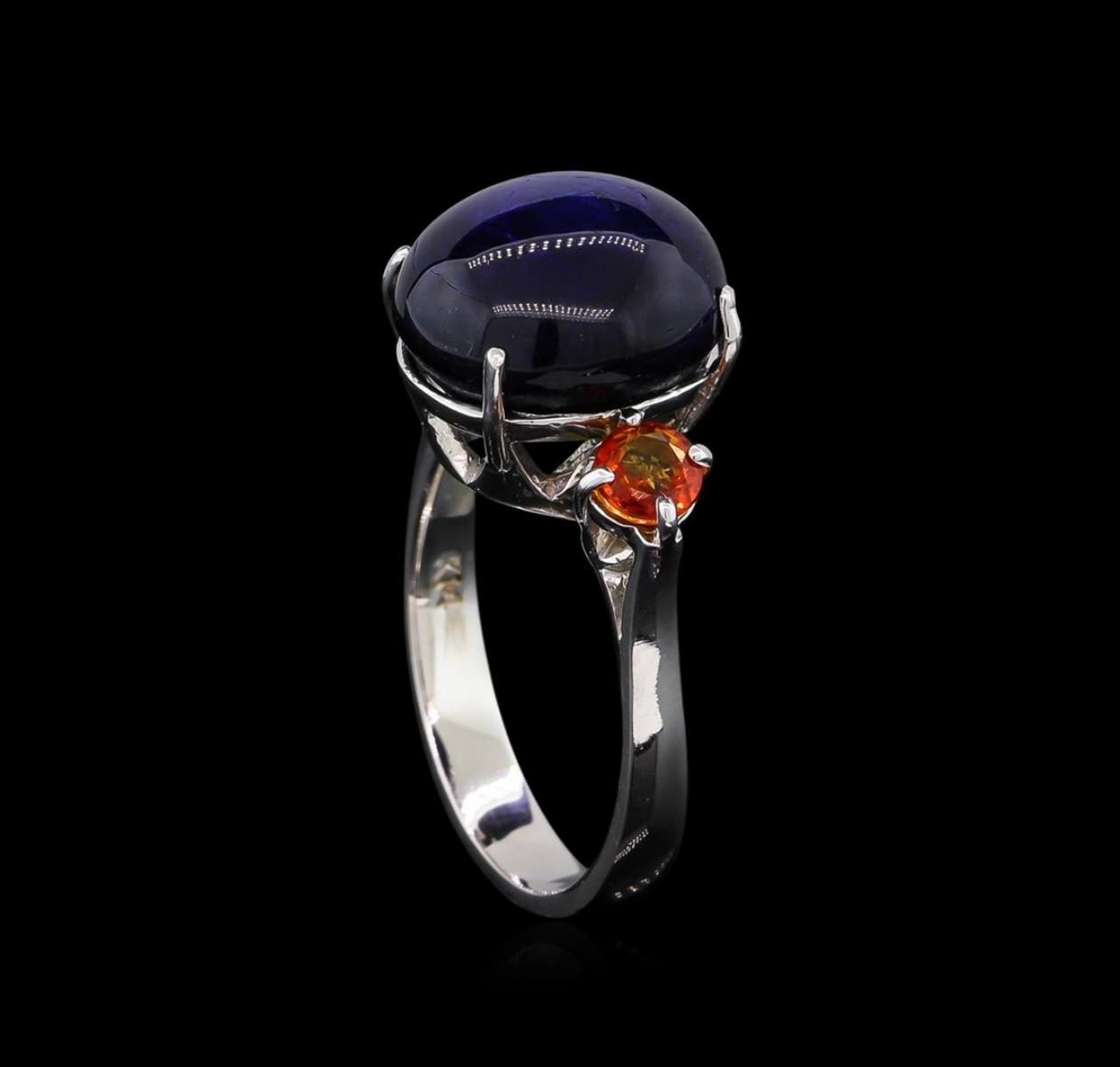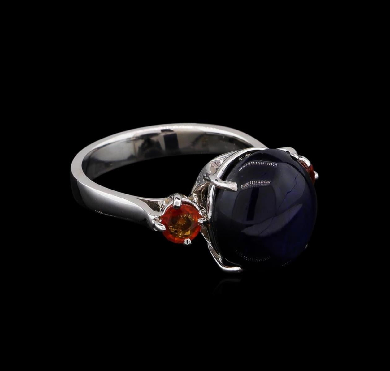 One ring featuring: 14KT white gold weighing 4.20 grams containing one blue sapphire with a total weight of 10.60ct and two orange sapphires with a total weight of 0.72ct.