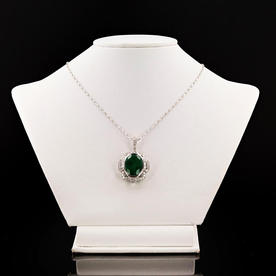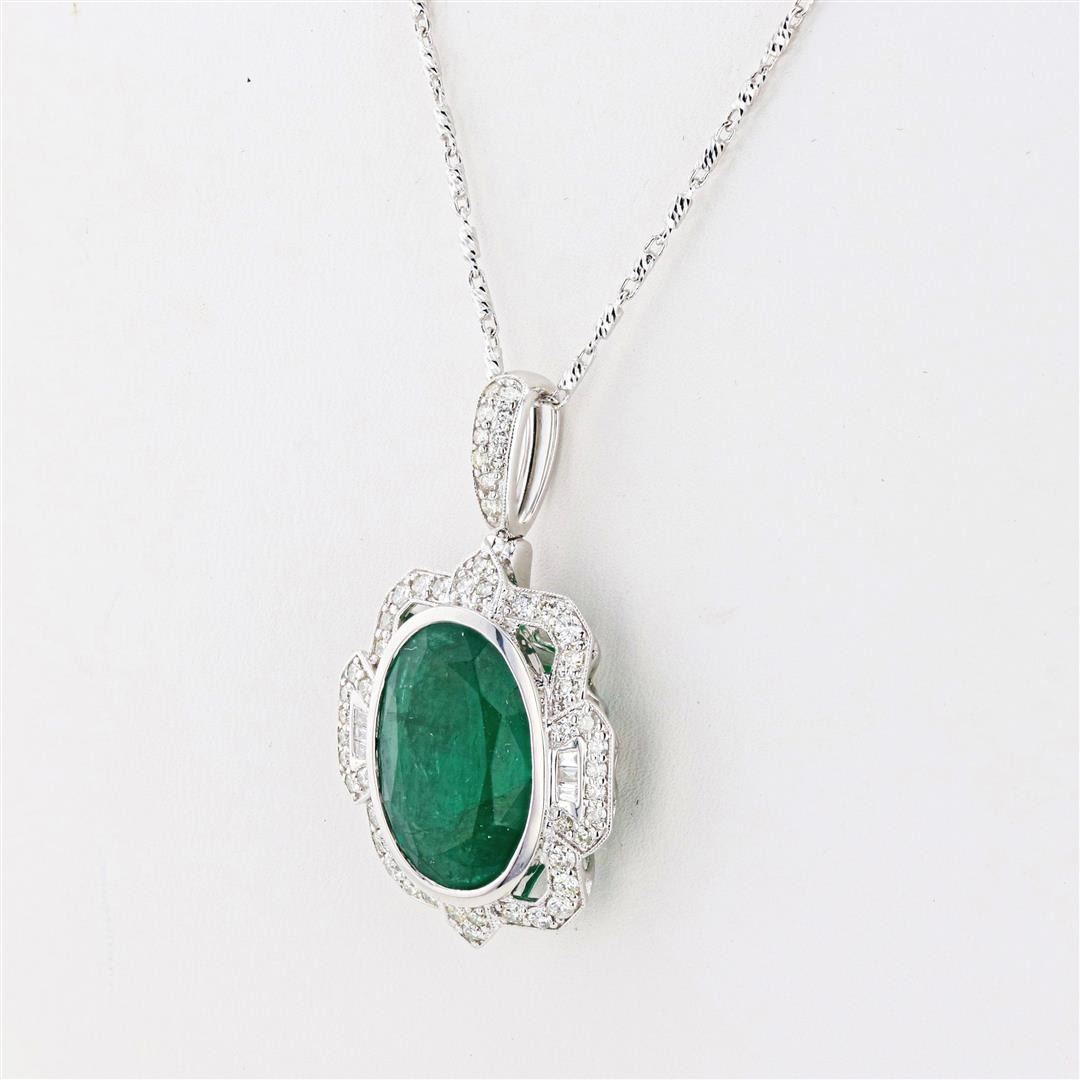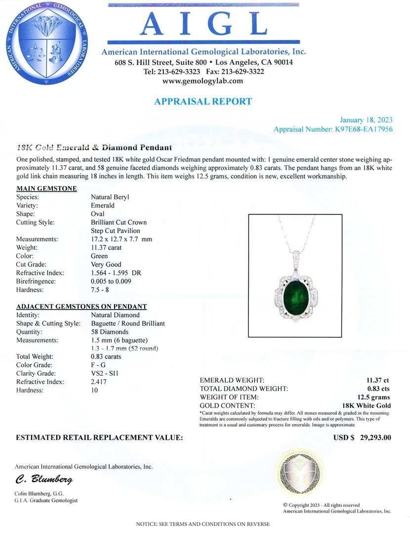 11.37ct Emerald and 0.83ctw Diamond 18K White Gold Pendant. One polished, stamped, and tested 18K white gold Oscar Friedman pendant mounted with: 1 genuine emerald center stone weighing approximately 11.37 carat, and 58 genuine faceted diamonds weighing approximately 0.83 carats. The pendant hangs from an 18K white gold link chain measuring 18 inches in length. This item weighs 12.5 grams, condition is new, excellent workmanship. MAIN GEMSTONE Species: Natural Beryl Variety: Emerald Shape: Oval Cutting Style: Brilliant Cut Crown, Step Cut Pavilion Measurements: 17.2 x 12.7 x 7.7mm Weight: 11.37 carat Color: Green Cut Grade: Very Good Refractive Index: 1.564 - 1.595 DR Birefringence: 0.005 to 0.009 Hardness: 7.5 - 8 ADJACENT GEMSTONES ON PENDANT Identity: Natural Diamond Shape and Cutting Style: Baguette / Round Brilliant Quantity: 58 Diamonds Measurements: 1.5mm (6 baguette), 1.3 - 1.7mm (52 round) Total Weight: 0.83 carats Color Grade: F - G Clarity Grade: VS2 - SI1 Refractive Index: 2.417 Hardness: 10 EMERALD WEIGHT: 11.37 ct TOTAL DIAMOND WEIGHT: 0.83 cts WEIGHT OF ITEM: 12.5 grams GOLD CONTENT: 18K White Gold