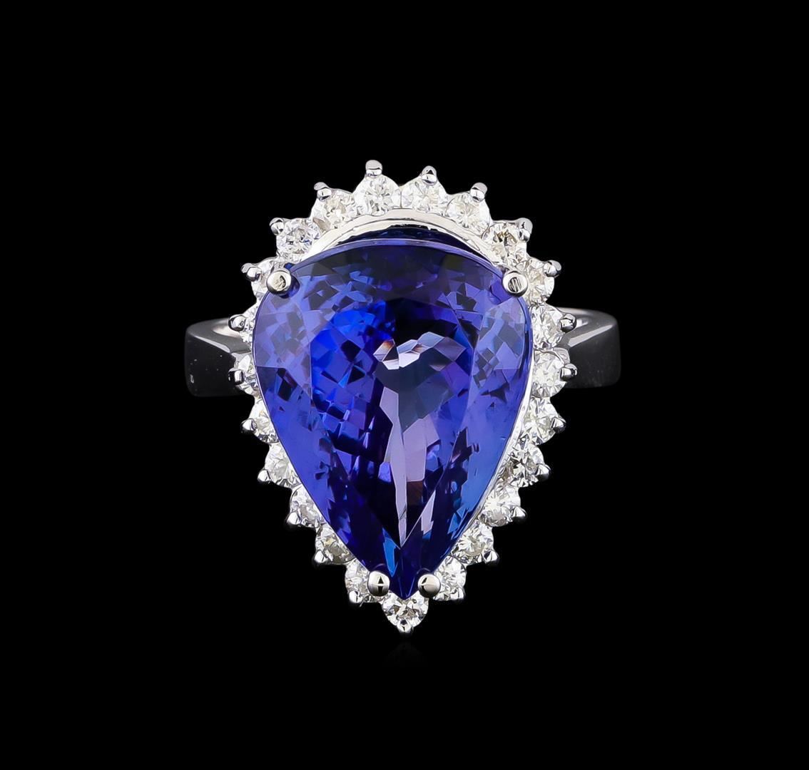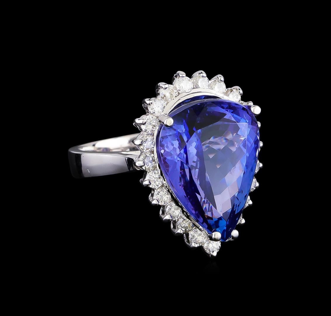 One electronically tested 14KT white gold lady's cast fashion ring with a basket halo with a bright polish finish. The featured lady's ring has a shank measuring 3.14 millimeters wide. Identified with markings of "K14". Condition is new, good workmanship. Containing: One prong set pear modified brilliant cut natural tanzanite, measuring 16.06 x 12.40 x 8.53mm, (depth est.) approximate weight of 11.38ct., clarity is eye clean, medium, very slightly grayish, violetish blue color, (GIA vB 5/3), cut is very good. Transmitting light with no distortion, transparent. Colored gemstones are presumed to have been subjected to commonly used enhancement processes. Graded in the setting. Twenty-Three prong set round brilliant cut diamonds, measuring 2.10 - 2.00 x 1.27mm (depth est.) approximate total weight of 23 Stones = 0.75ct. Graded in the setting. Clarity: SI-1 to SI-2. Color: G - Good. Total Weight of Colored Stones 11.38ct. Total Weight of Diamonds 0.75ct. Total Weight of Ring 8.40gm GAS Appraised.