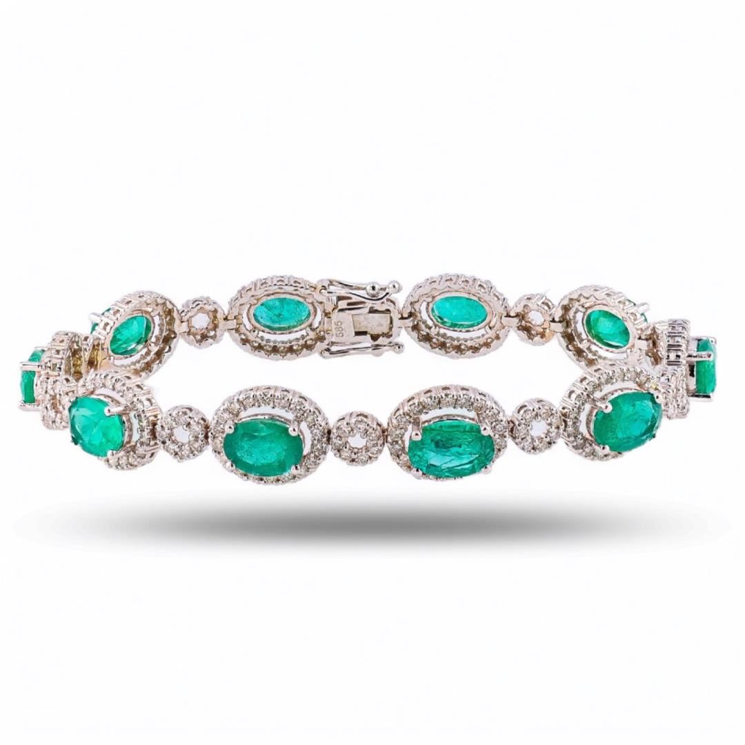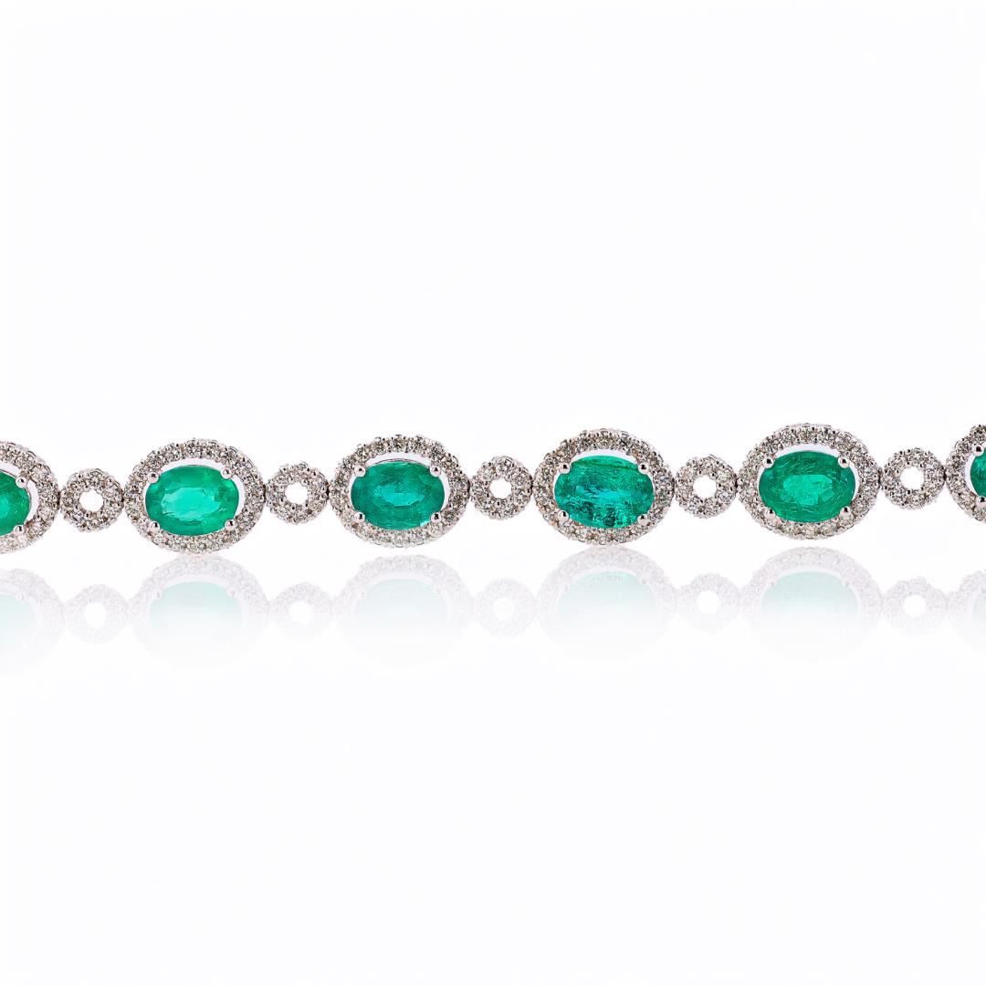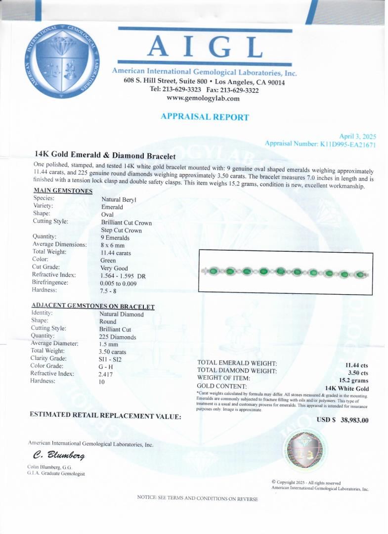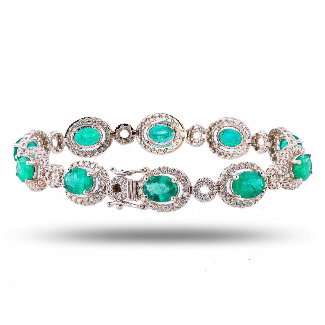 One polished, stamped, and tested 14K white gold bracelet mounted with: 9 genuine oval shaped emeralds weighing approximately 11.44 carats, and 225 genuine round diamonds weighing approximately 3.50 carats. The bracelet measures 7.0 inches in length and is finished with a tension lock clasp and double safety clasps. This item weighs 15.2 grams, condition is new, excellent workmanship. #MAIN GEMSTONES# Species: Natural Beryl Variety Emerald Shape: Oval Cutting Style: Brilliant Cut Crown, Step Cut Crown Quantity: 9 Emeralds Average Dimensions: 8 x 6mm Total Weight: 11.44 carats Color: Green Cut Grade: Very Good Refractive Index: 1.564 - 1.595 DR Birefringence: 0.005 to 0.009 Hardness: 7.5-8 #ADJACENT GEMSTONES ON BRACELET# Identity: Natural Diamond Shape: Round Cutting Style: Brilliant Cut Quantity: 225 Diamonds Average Diameter: 1.5mm Total Weight: 3.50 carats Clarity Grade: SI1-SI2 Color Grade: G-H Refractive Index: 2.417 Hardness: 10 #TOTAL EMERALD WEIGHT: 11.44 cts TOTAL DIAMOND WEIGHT: 3.50 cts WEIGHT OF ITEM: 15.2 grams GOLD CONTENT: 14K White Gold Size: 7