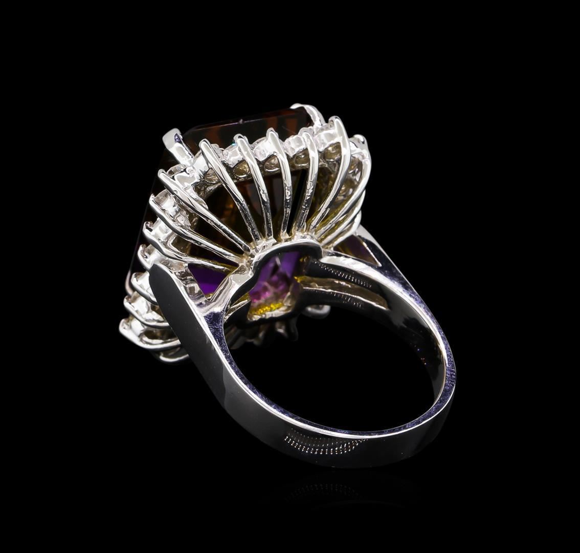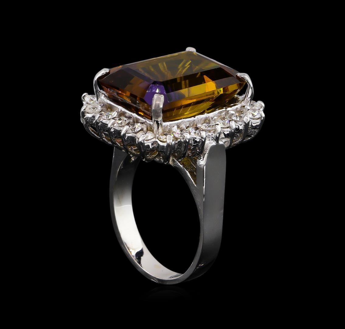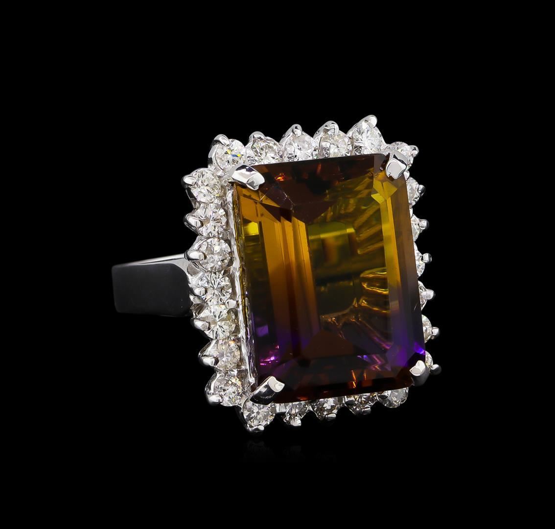 One electronically tested 14KT white gold lady's cast fashion ring with a basket halo with a bright polish finish. The featured lady's ring has a shank measuring 3.01 millimeters wide. Identified with markings of "585". Condition is new, good workmanship. Containing: One prong set emerald step cut natural ametrine quartz, measuring 16.03 x 12.16 x 8.09mm, approximate weight of 11.52ct., clarity is eye clean, type I, medium, moderately strong, purple color, (GIA P 5/4) to medium dark, moderately strong, yellowish orange, (GIA yO 6/4), cut is very good. Transmitting light with no distortion, transparent. Colored gemstones are presumed to have been subjected to commonly used enhancement processes. Graded in the setting. Twenty-Four prong set round brilliant cut diamonds, measuring 2.30 - 2.20 x 1.37mm (depth est.) approximate total weight of 24 Stones = 1.02ct. Graded in the setting. Clarity: SI-1 to SI-2. Color: G - I. Cut Good. Total Weight of Colored Stones 11.52ct. Total Weight of Diamonds 1.02ct. Total Weight of Ring 10.20gm. GAS Appraised.