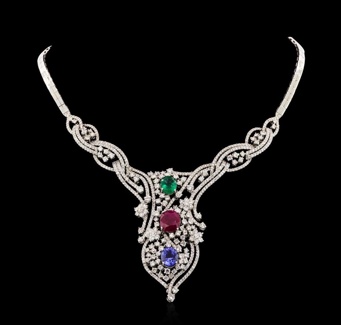 One electronically tested 14KT white gold necklace weighing 44.74 grams including round cut diamonds weighing 12.39ctw, one center oval shape natural ruby weighing 5.01ctw, one center oval shape Ceylon natural sapphire weighing 4.15ctw and one center oval shape fine natural emerald weighing 2.40ctw. All VS-SI, G-H color. All center stones fine cutting, fine quality. RBGS Appraised.