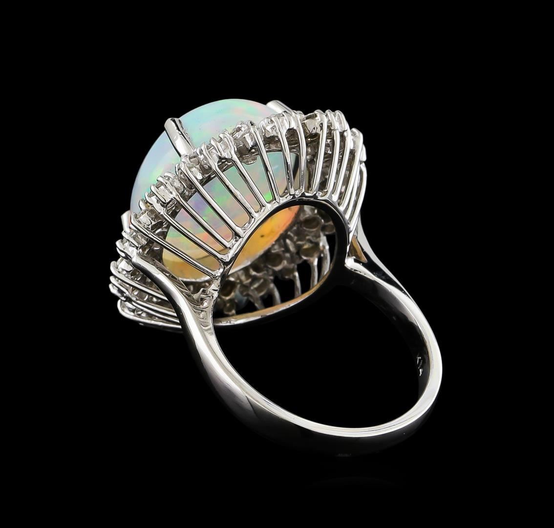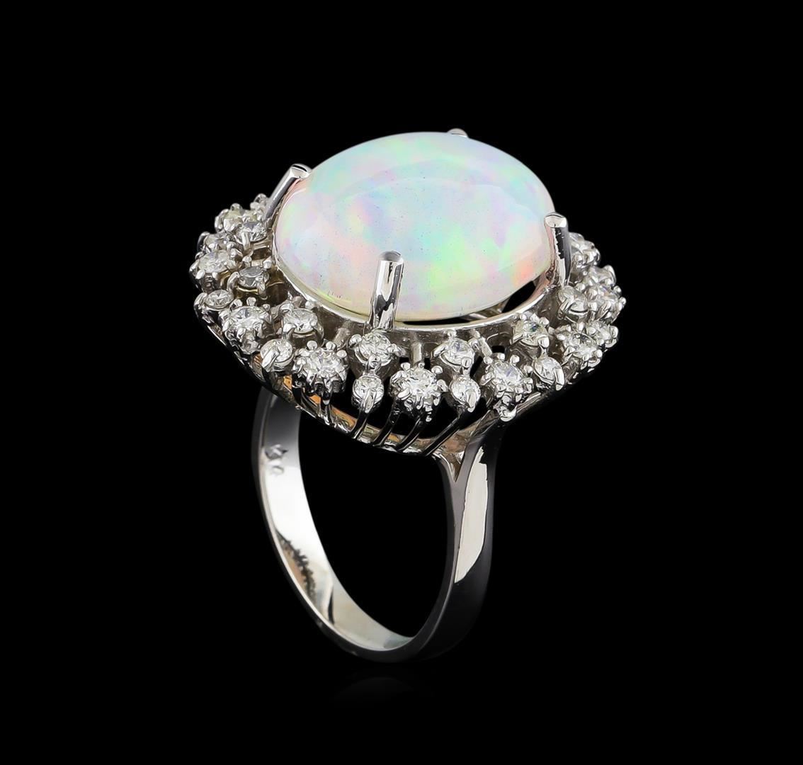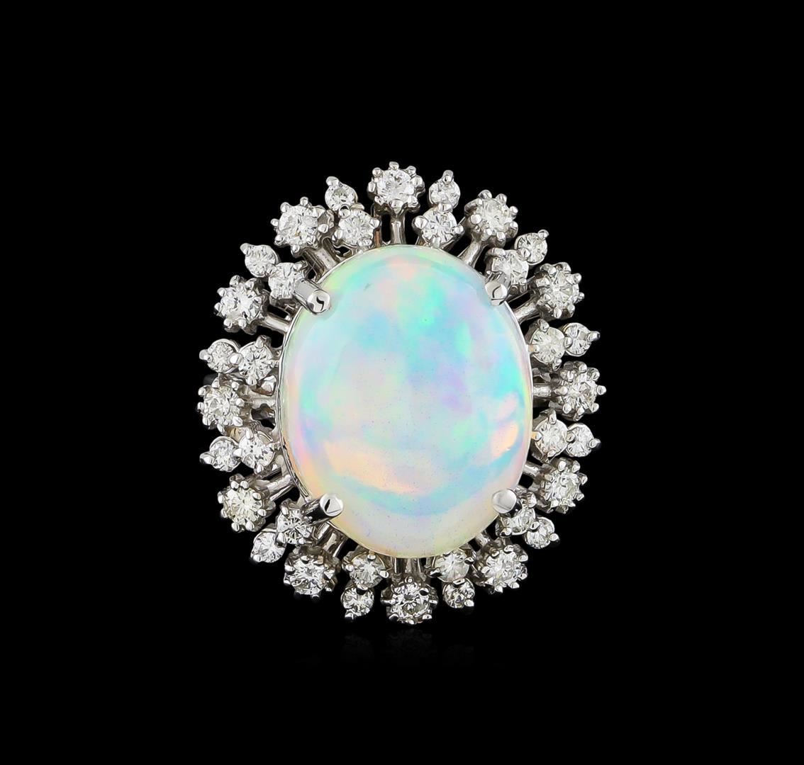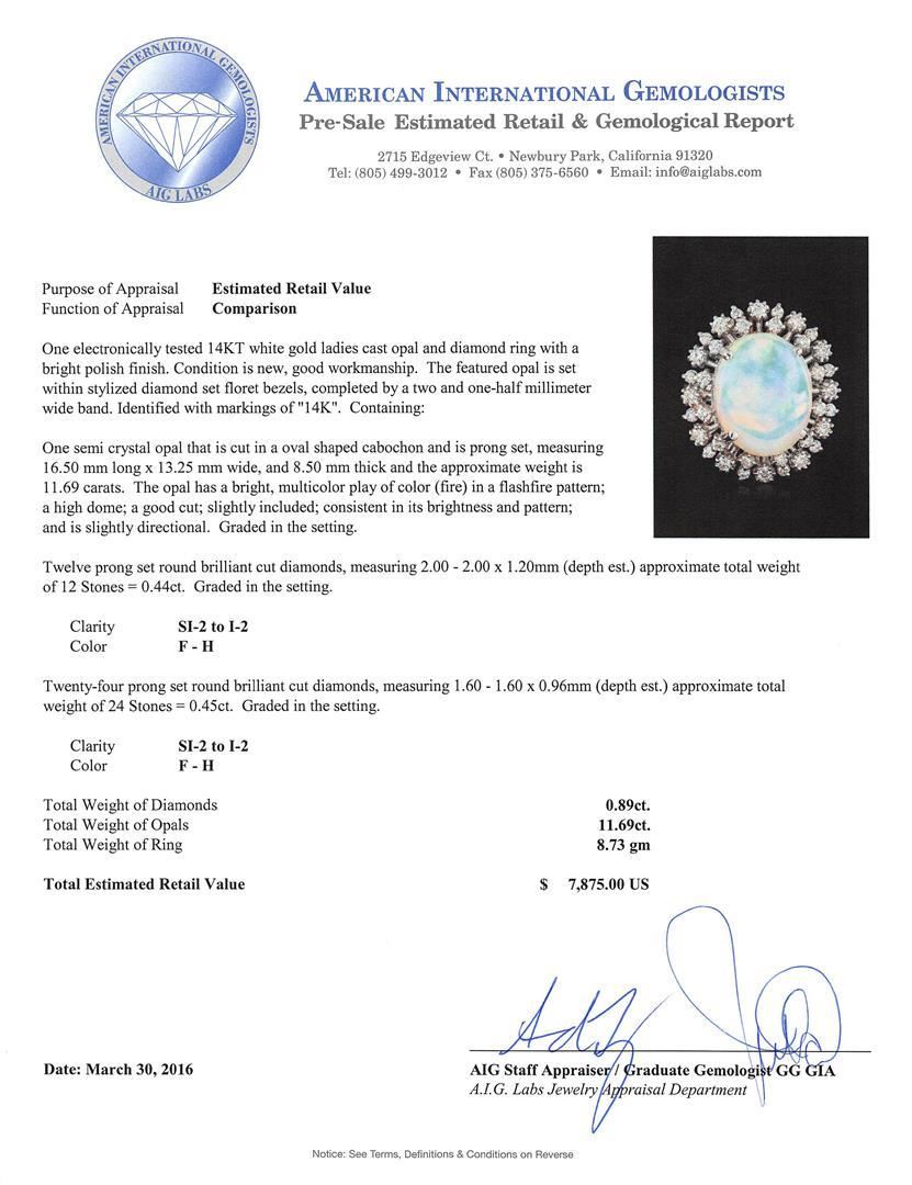 One electronically tested 14KT white gold ladies cast opal and diamond ring with a bright polish finish. The featured opal is set within stylized diamond set floret bezels, completed by a two and one-half millimeter wide band. Identified with markings of "14K". Condition is new, good workmanship. Containing: One semi crystal opal that is cut in a oval shaped cabochon and is prong set, measuring 16.50 mm long x 13.25 mm wide, and 8.50 mm thick and the approximate weight is 11.69 carats. The opal has a bright, multicolor play of color (fire) in a flashfire pattern; a high dome; a good cut; slightly included; consistent in its brightness and pattern; and is slightly directional. Graded in the setting. Twelve prong set round brilliant cut diamonds, measuring 2.00 - 2.00 x 1.20mm (depth est.) approximate. Total Weight of 12 Stones = 0.44ct. Graded in the setting. Clarity: SI-2 to I-2. Color: F - H Twenty-Four prong set round brilliant cut diamonds, measuring 1.60 - 1.60 x 0.96mm (depth est.) approximate. Total Weight of 24 Stones = 0.45ct. Graded in the setting. Clarity: SI-2 to I-2. Color: F - H. Total Weight of Diamonds 0.89ct. Total Weight of Opals 11.69ct. Total Weight of Ring 8.73gm. AIG Appraised.