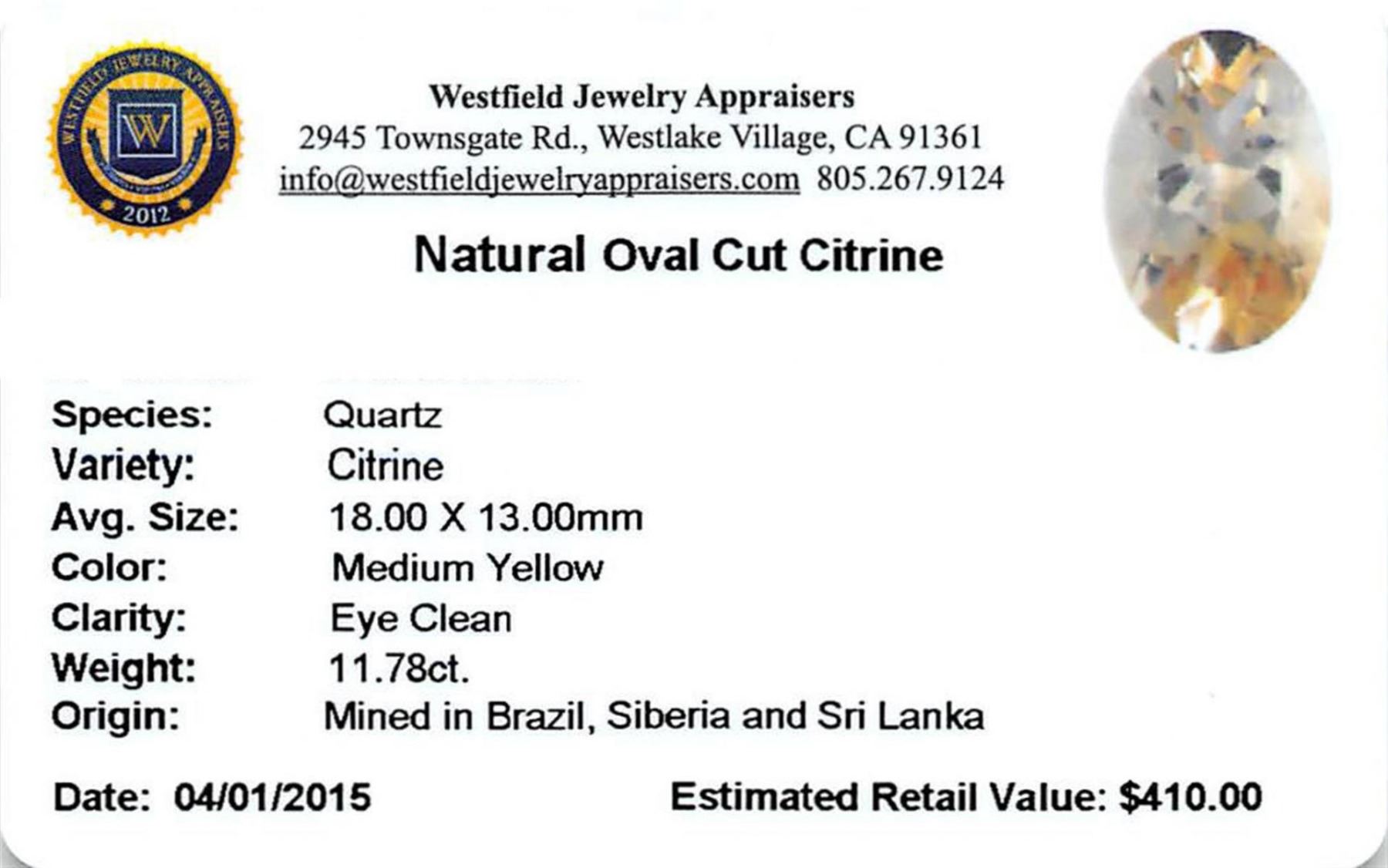 One oval cut natural citrine quartz exact weight 11.78ct., clarity is eye clean, type I, medium, slightly brownish, yellowish orange color, (GIA yO 5/2), cut is good. Westfield Appraised at $410.00.