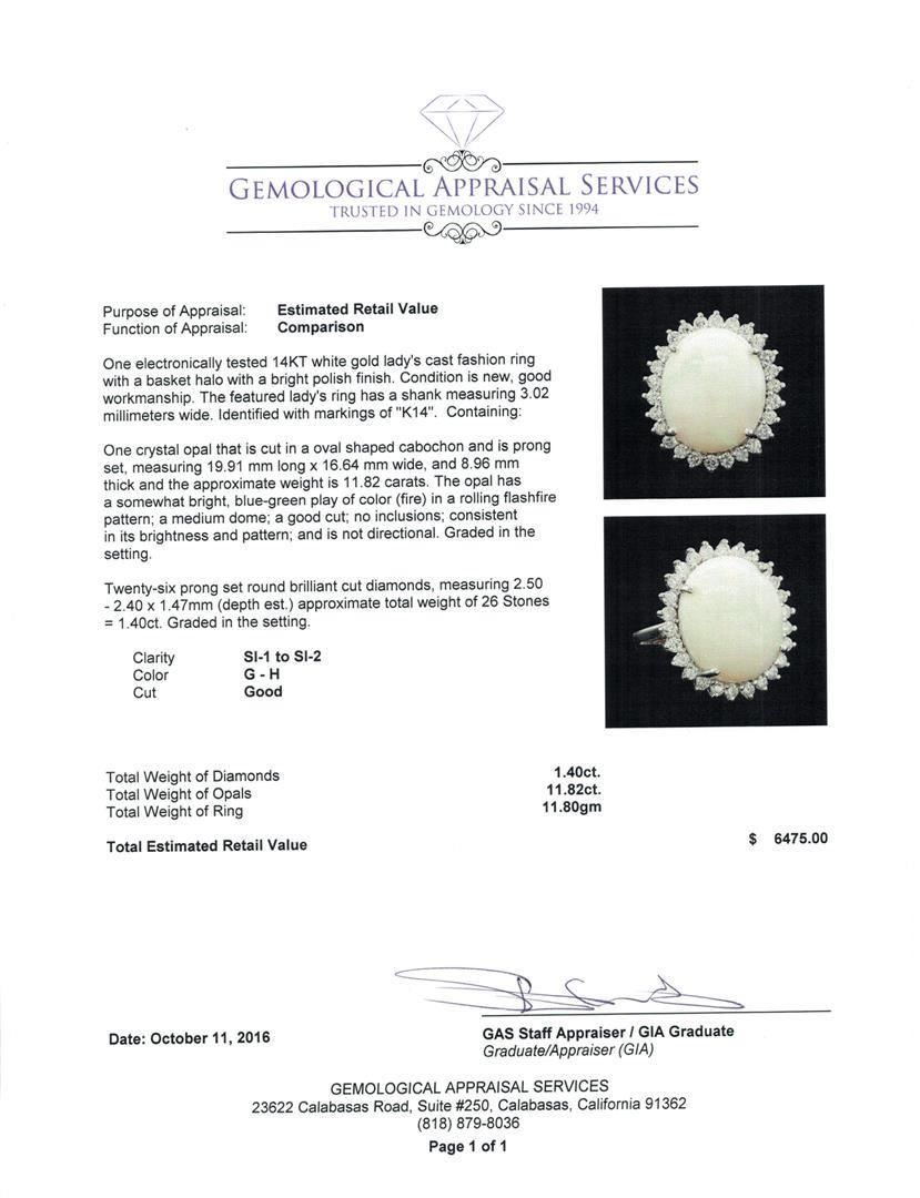 One electronically tested 14KT white gold lady's cast fashion ring with a basket halo with a bright polish finish. The featured lady's ring has a shank measuring 3.02 millimeters wide. Identified with markings of 'K14'. Condition is new, good workmanship. Containing: One crystal opal that is cut in a oval shaped cabochon and is prong set, measuring 19.91 mm long x 16.64 mm wide, and 8.96 mm thick and the approximate weight is 11.82 carats. The opal has a somewhat bright, blue-green play of color (fire) in a rolling flashfire pattern; a medium dome; a good cut; no inclusions; consistent in its brightness and pattern; and is not directional. Graded in the setting. Twenty-Six prong set round brilliant cut diamonds, measuring 2.50 - 2.40 x 1.47mm (depth est.) approximate total weight of 26 Stones = 1.40ct. Graded in the setting. Clarity SI-1 to SI-2. Color: G - H Cut Good. Total Weight of Diamonds 1.40ct.. Total Weight of Opals 11.82ct.. Total Weight of Ring 11.80gm. GAS Appraised.