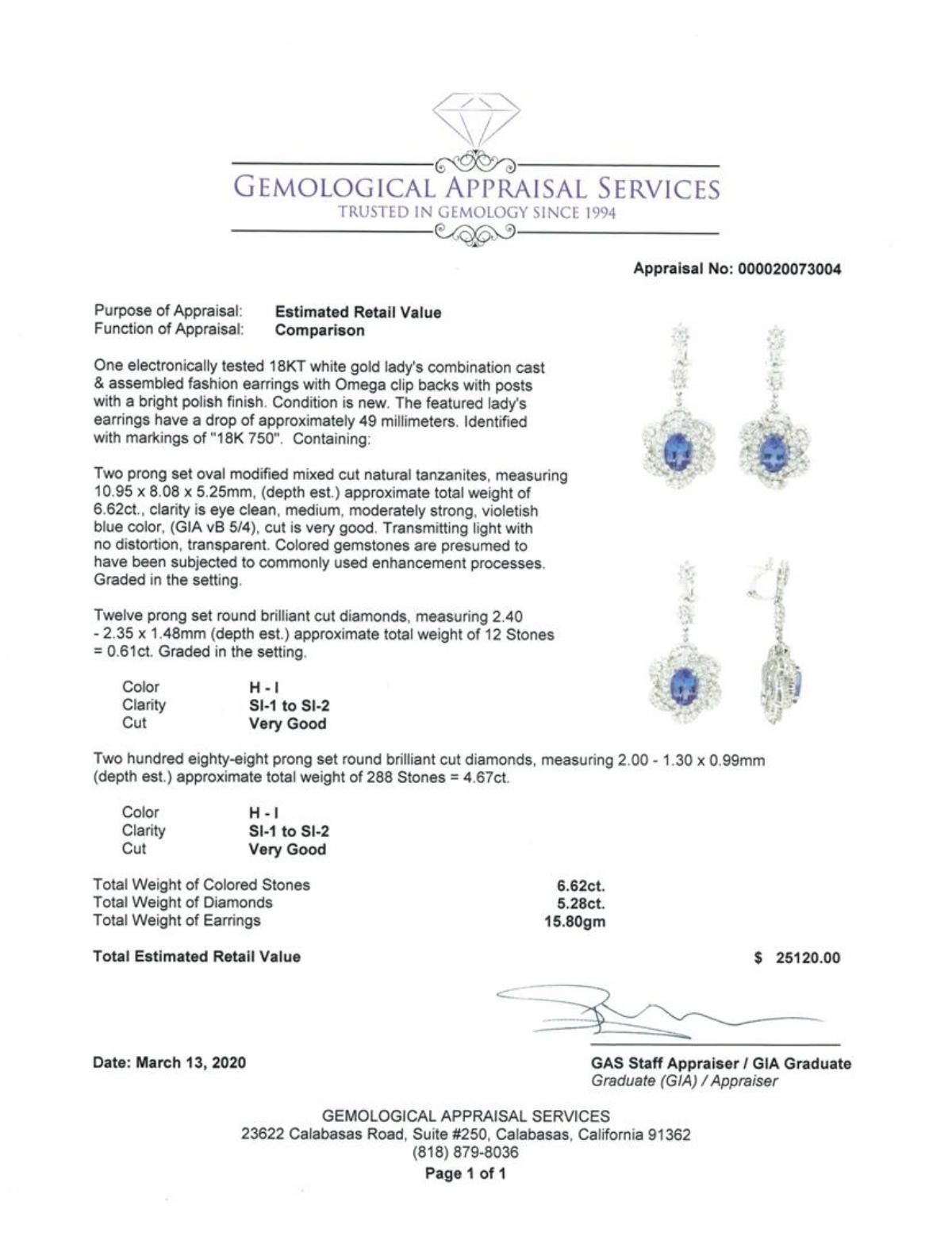 One electronically tested 18KT white gold lady's combination cast & assembled fashion earrings with Omega clip backs with posts with a bright polish finish. The featured lady's earrings have a drop of approximately 49 millimeters. Identified with markings of '18K 750'. Condition is new. Containing: Two prong set oval modified mixed cut natural tanzanites, measuring 10.95 x 8.08 x 5.25mm, (depth est.) approximate total weight of 6.62ct., clarity is eye clean, medium, moderately strong, violetish blue color, (GIA vB 5/4), cut is very good. Transmitting light with no distortion, transparent. Colored gemstones are presumed to have been subjected to commonly used enhancement processes. Graded in the setting. Twelve prong set round brilliant cut diamonds, measuring 2.40 - 2.35 x 1.48mm (depth est.) approximate total weight of 12 Stones = 0.61ct. Graded in the setting. Color H - I Clarity SI-1 to SI-2 Cut Very Good Two Hundred Eighty-Eight prong set round brilliant cut diamonds, measuring 2.00 - 1.30 x 0.99mm (depth est.) approximate total weight of 288 Stones = 4.67ct. Color H - I Clarity SI-1 to SI-2 Cut Very Good. Total Weight of Colored Stones 6.62ct.. Total Weight of Diamonds 5.28ct.. Total Weight of Earrings 15.80gm GAS Appraised at $25120.00. GAS Appraised.
