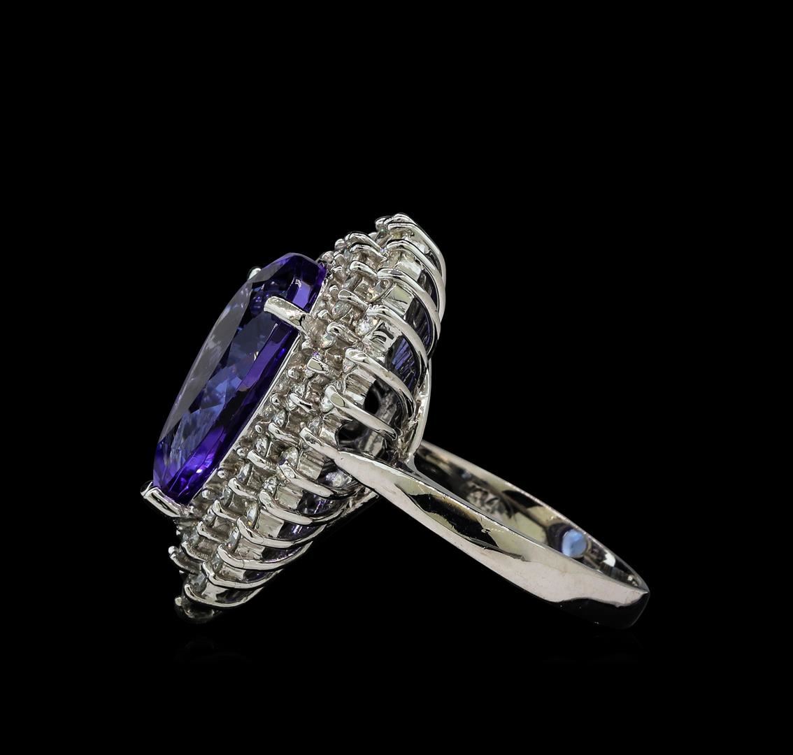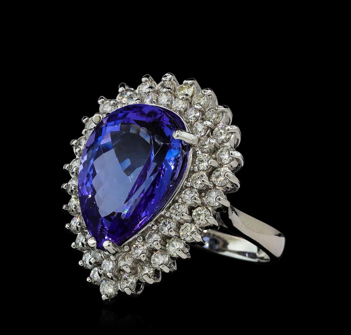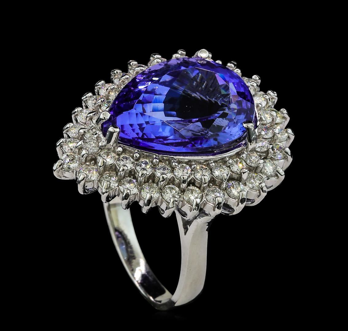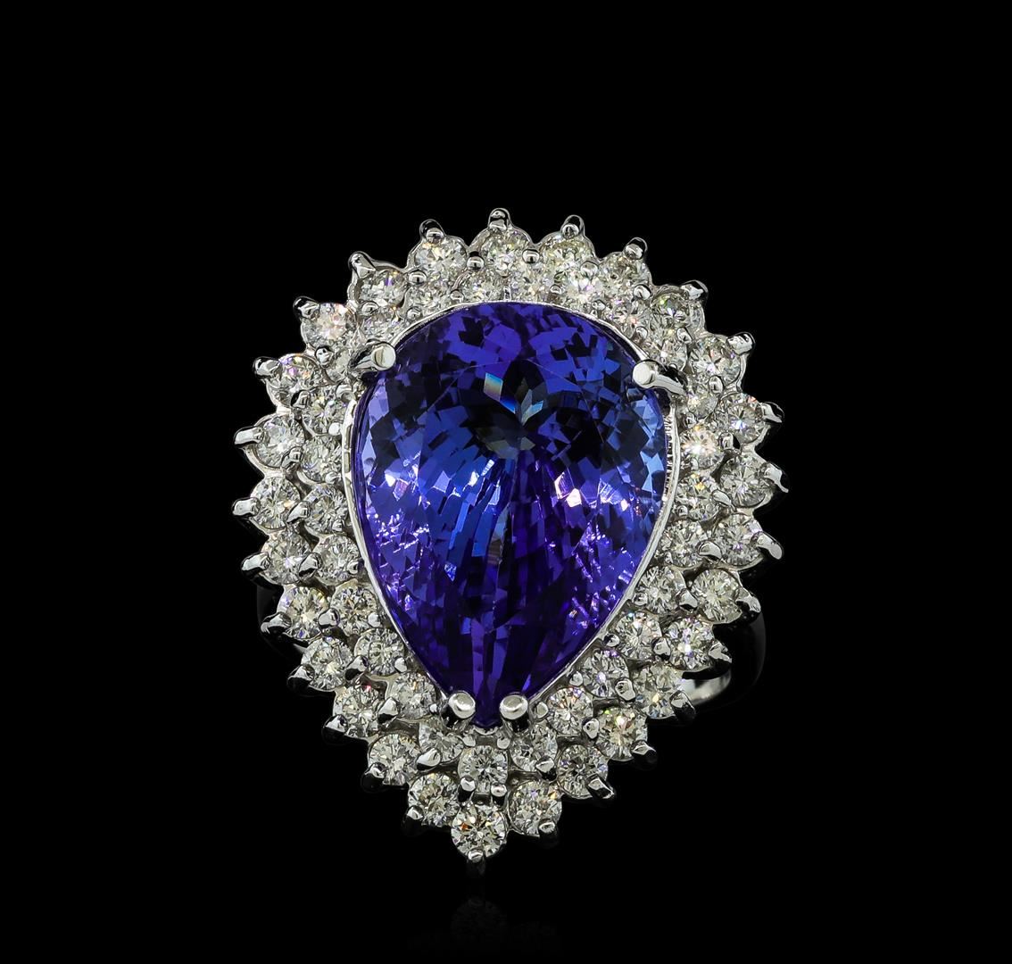One electronically tested 14KT white gold ladies cast tanzanite and diamond ring with a bright polish finish. The featured tanzanite is set within a tiered diamond floret supported by a ribbed under gallery, completed by a two millimeter wide band. Identified with markings of 'K14'. Condition is new, good workmanship. Containing: One prong set pear mixed cut natural tanzanite, measuring 16.90 x 12.00 x 8.50mm, 3%. bulge factor, approximate weight of 11.90ct., clarity is eye clean, type I, medium, very slightly grayish, bluish violet color, (GIA bV 5/3), cut is good. Transmitting light with no distortion, transparent. Colored Stone Grading Report attached. Graded in the setting. Tanzanite is a very rare gemstone that is only found in the country of Tanzania. Originally discovered in 1967. Tiffany & Company, named the stone Tanzanite. It is found in the Usumburu Mountains that border the Umba Valley of northern Tanzania. Tanzanite occurs in gray, brown, violet, blue, reddish-purple, & green. The gem is interesting because of its exceptional pleochroism. Rotated in different directions a tanzanite will exhibit multiple changes of color. Tanzanite has a low tolerance to ultrasonic cleaning, and should not be cleaned using this method. Twenty-Seven prong set round brilliant cut diamonds, measuring 2.10 - 2.00 x 1.23mm (depth est.) approximate total weight of 27 Stones = 0.90ct. Graded in the setting. Clarity SI-2 to I-2. Color: F - H Twenty-Six prong set round brilliant cut diamonds, measuring 1.90 - 1.90 x 1.14mm (depth est.) approximate total weight of 26 Stones = 0.70ct. Graded in the setting. Clarity SI-1 to I-1. Color: F - H. Total Weight of Colored Stones 11.90ct.. Total Weight of Diamonds 1.60ct.. Total Weight of Ring 11.06gm. AIG Appraised at $30,360.00.