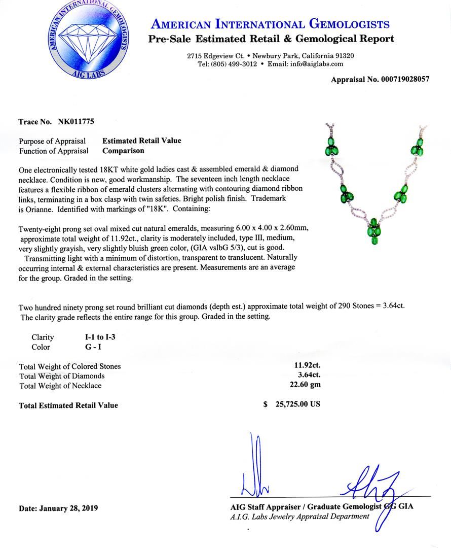 One electronically tested 18KT white gold ladies cast and assembled emerald and diamond necklace. Condition is new, good workmanship. The seventeen inch length necklace features a flexible ribbon of emerald clusters alternating with contouring diamond ribbon links, terminating in a box clasp with twin safeties. Bright polish finish. Trademark is Orianne. Identified with markings of "18K". Containing: Twenty-eight prong set oval mixed cut natural emeralds, measuring 6.00 x 4.00 x 2.60mm, approximate total weight of 11.92ct., clarity is moderately included, type III, medium, very slightly grayish, very slightly bluish green color, (GIA vslbG 5/3), cut is good. Transmitting light with a minimum of distortion, transparent to translucent. Naturally occurring internal and external characteristics are present. Measurements are an average for the group. Graded in the setting. Two hundred ninety prong set round brilliant cut diamonds (depth est.) approximate total weight of 290 Stones = 3.64ct. The clarity grade reflects the entire range for this group. Graded in the setting. Clarity I-1 to I-3 Color G-I Total Weight of Colored Stones 11.92ct. Total Weight of Diamonds 3.64ct. Total Weight of Necklace 22.60 gm