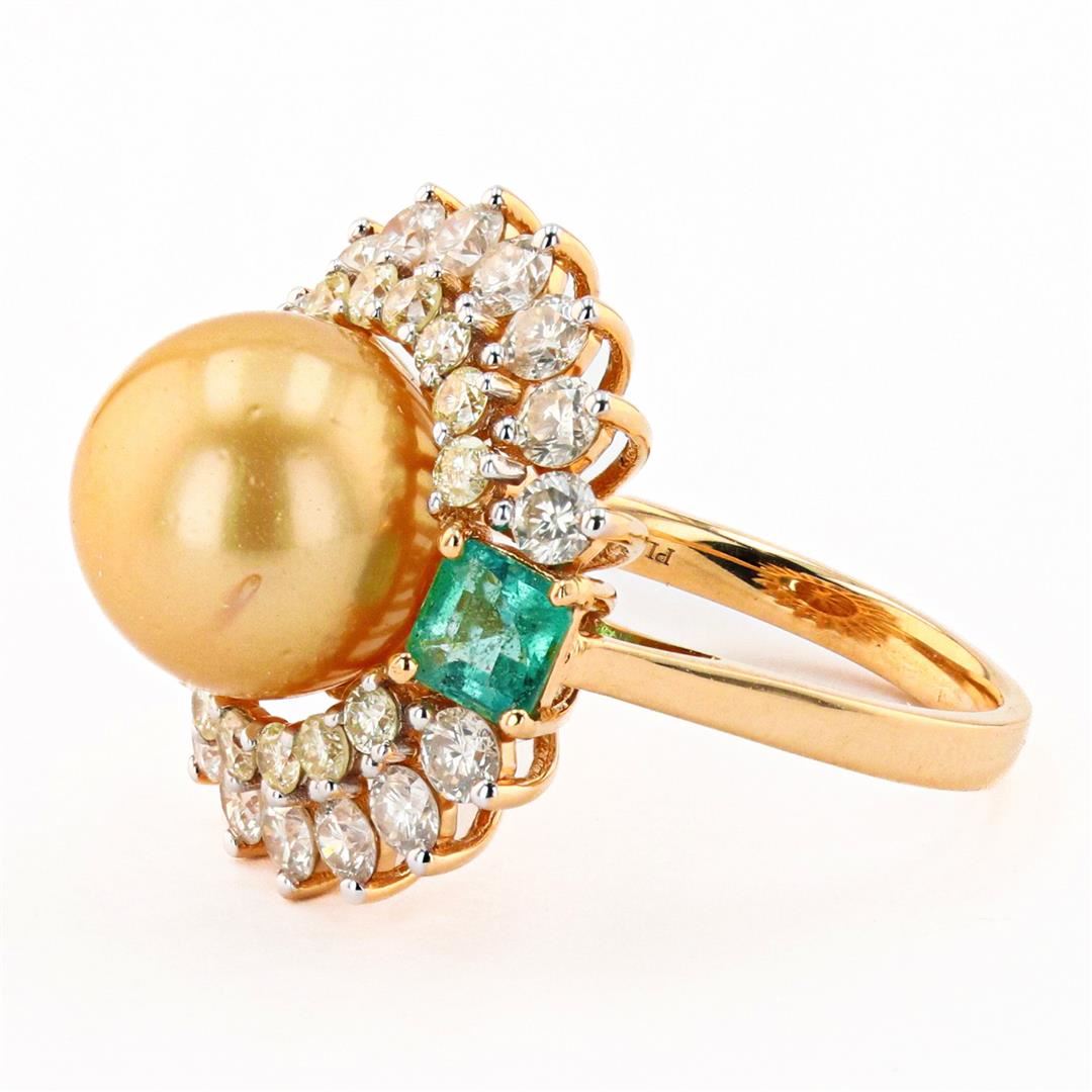 18K Gold South Sea Pearl, Emerald & Diamond Ring one polished, stamped, and tested I8K yellow gold ring marked Oscar briedman. I he ring is mounted with: I genuine cultured South Sea Pearl, 2 genuine faceted emeralds weighing approximately 0.80 carats, an