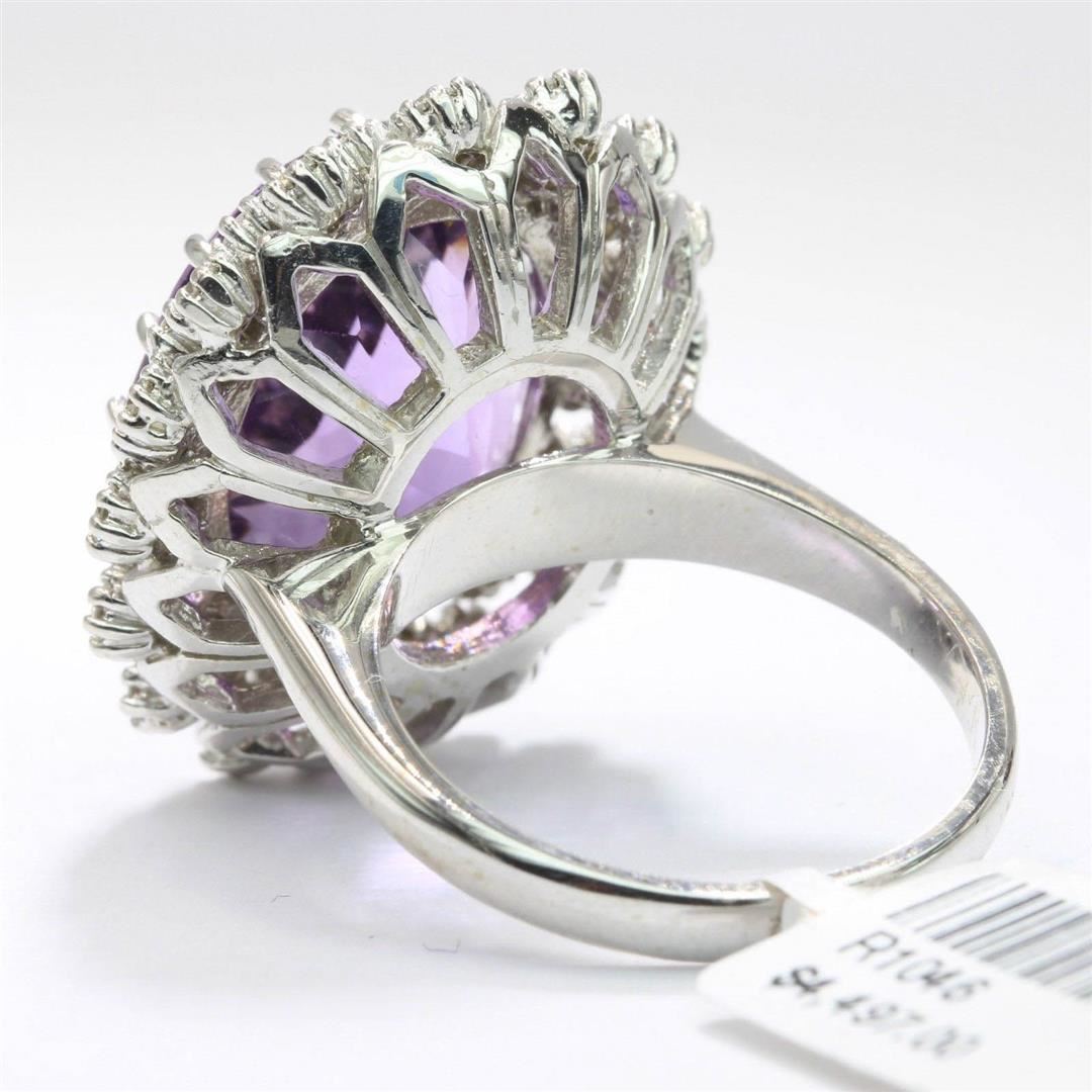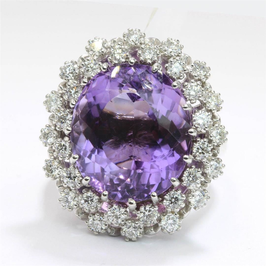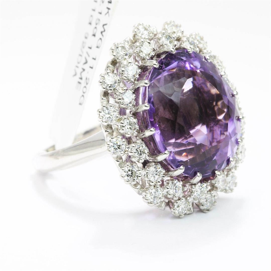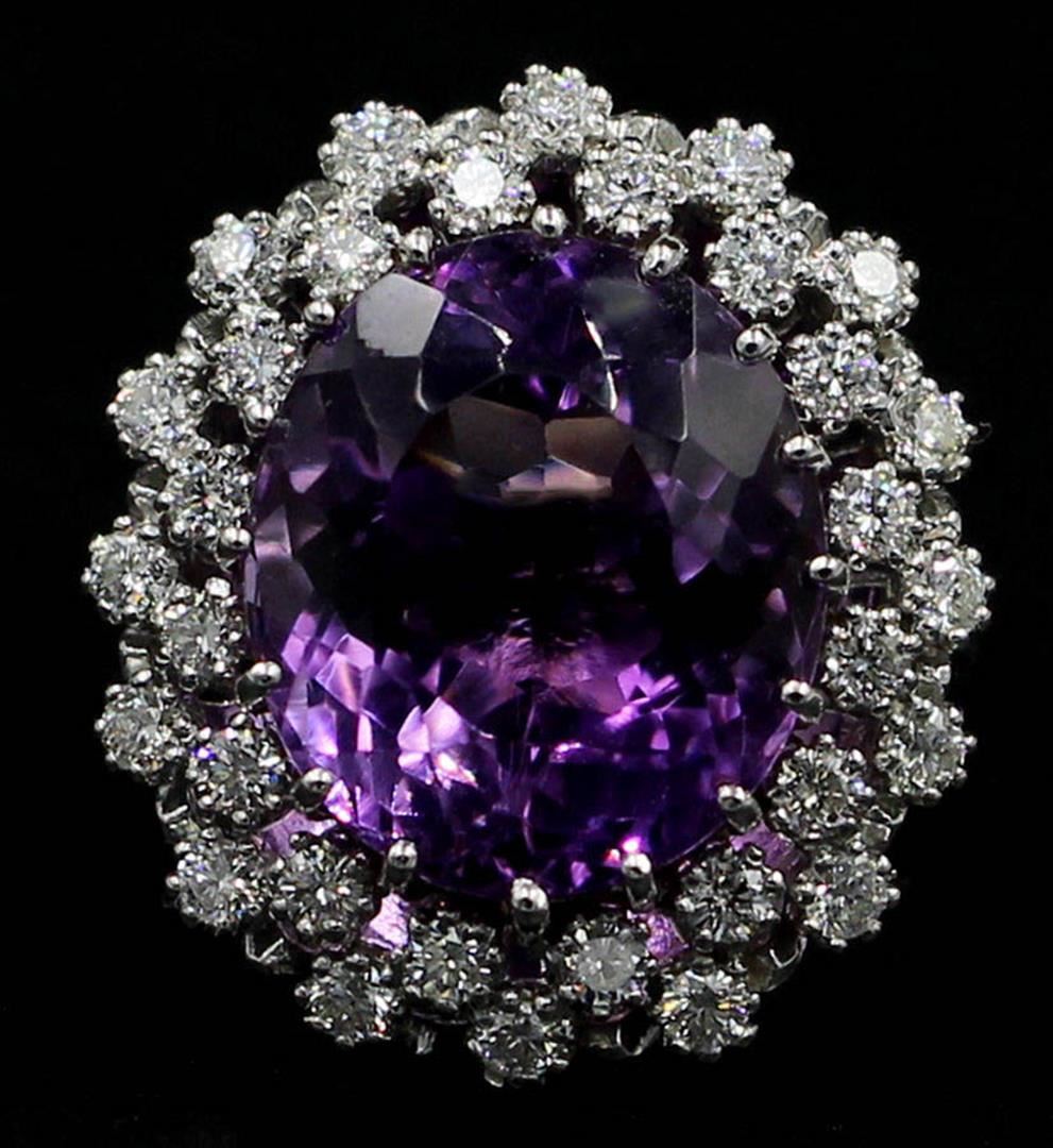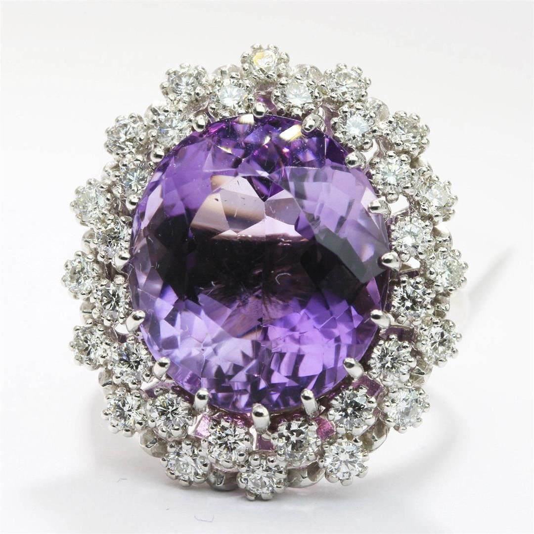One lady's band ring featuring: 14KT white gold weighing 11.20 grams containing one amethyst weighing 12.15ct and 32 diamonds weighing 1.11ctw. The amethyst is oval brilliant cut with good clarity, excellent cut and purple color and measures approximately 16.00mm x 13.60mm. The diamonds are round brilliant cut and are natural, unenhanced stones with SI clarity, G color and excellent cut. Ring size is 6.5 but is resizable.