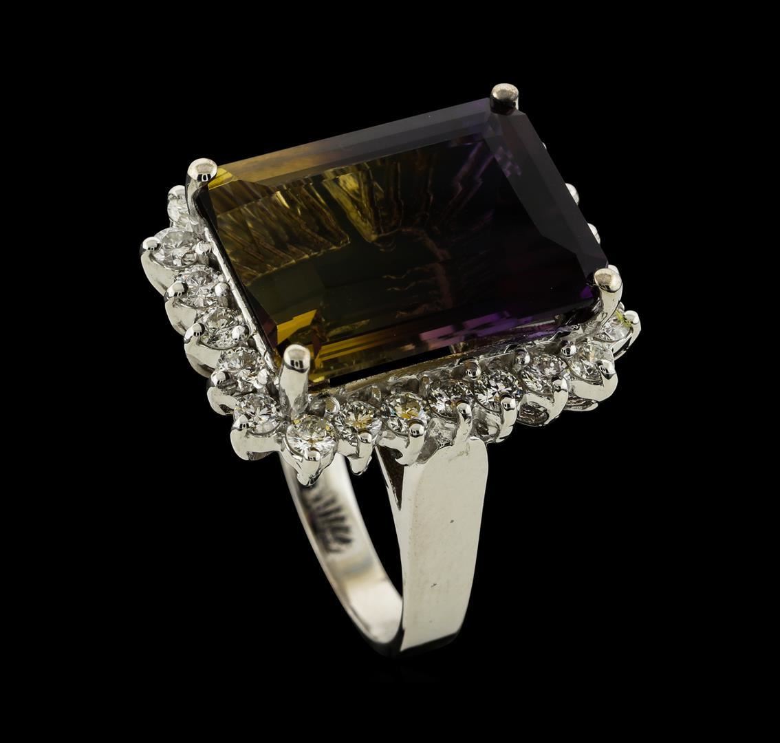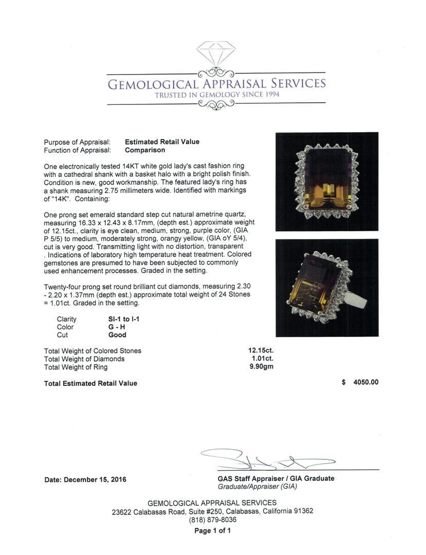 One electronically tested 14KT white gold lady's cast fashion ring with a cathedral shank with a basket halo with a bright polish finish. The featured lady's ring has a shank measuring 2.75 millimeters wide. Identified with markings of '14K'. Condition is new, good workmanship. Containing: One prong set emerald standard step cut natural ametrine quartz, measuring 16.33 x 12.43 x 8.17mm, (depth est.) approximate weight of 12.15ct., clarity is eye clean, medium, strong, purple color, (GIA P 5/5) to medium, moderately strong, orangy yellow, (GIA oY 5/4), cut is very good. Transmitting light with no distortion, transparent. Indications of laboratory high temperature heat treatment. Colored gemstones are presumed to have been subjected to commonly used enhancement processes. Graded in the setting. Twenty-Four prong set round brilliant cut diamonds, measuring 2.30 - 2.20 x 1.37mm (depth est.) approximate total weight of 24 Stones = 1.01ct. Graded in the setting. Clarity SI-1 to I-1. Color: G - H Cut Good. Total Weight of Colored Stones 12.15ct.. Total Weight of Diamonds 1.01ct.. Total Weight of Ring 9.90gm. GAS Appraised.