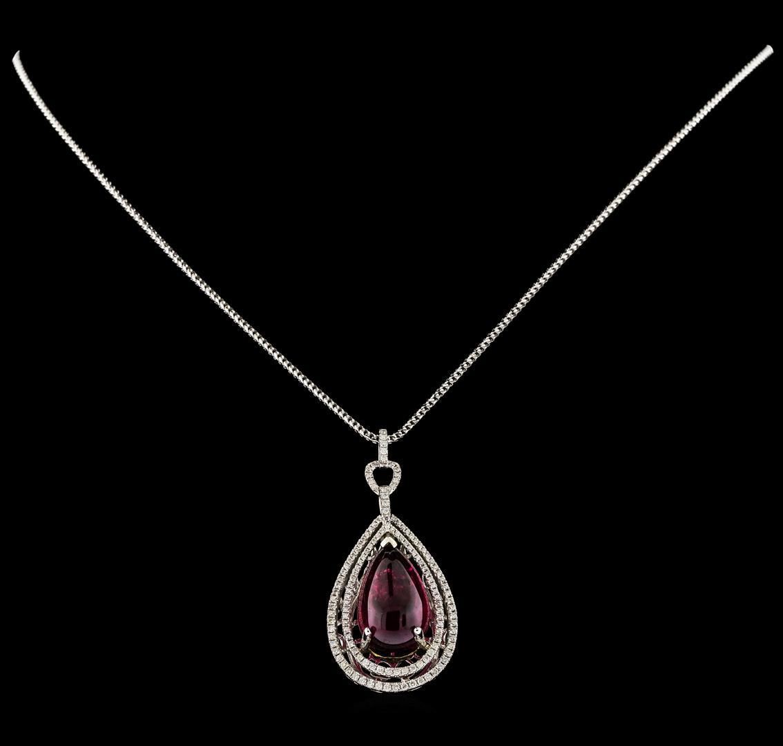 One 14KT White Gold "One of a Kind" Pendant with 18 inches chain included, 14.89 grams. Containing: Main Gemstones: Identity: Natural Tourmaline. Carat Weight: 12.33 cts tw. Shape & Measurement: Pear Shape Cabochon. Quality: Fine Rubellite Color Tourmaline. Fine Cutting. Adjacent Gemstones: Identity: Natural Diamonds. Shape: Round Brilliant Cut. Carat Weight: 0.67 cts tw. Quality: SI Clarity, G-H Color. All fine cutting and proportions. Total Gemstones Weight: 13.00 cts tw. RBGS Appraised.