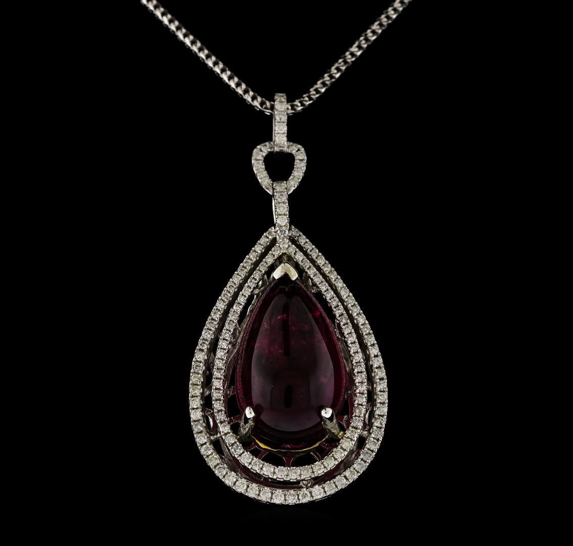 One 14KT White Gold "One of a Kind" Pendant with 18 inches chain included, 14.89 grams. Containing: Main Gemstones: Identity: Natural Tourmaline. Carat Weight: 12.33 cts tw. Shape & Measurement: Pear Shape Cabochon. Quality: Fine Rubellite Color Tourmaline. Fine Cutting. Adjacent Gemstones: Identity: Natural Diamonds. Shape: Round Brilliant Cut. Carat Weight: 0.67 cts tw. Quality: SI Clarity, G-H Color. All fine cutting and proportions. Total Gemstones Weight: 13.00 cts tw. RBGS Appraised.