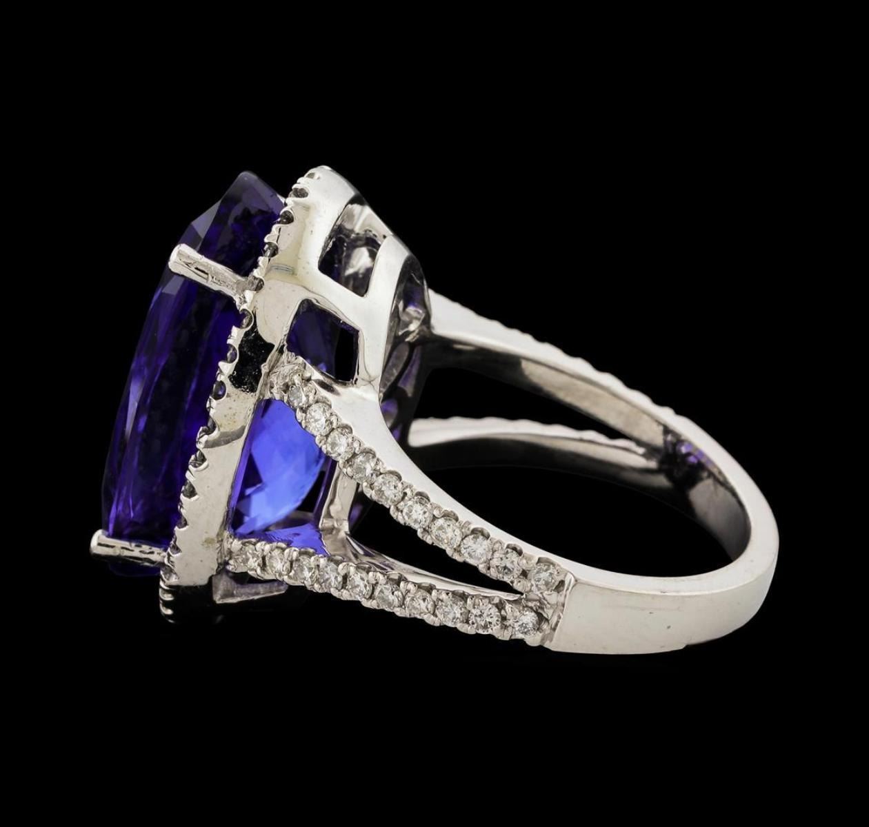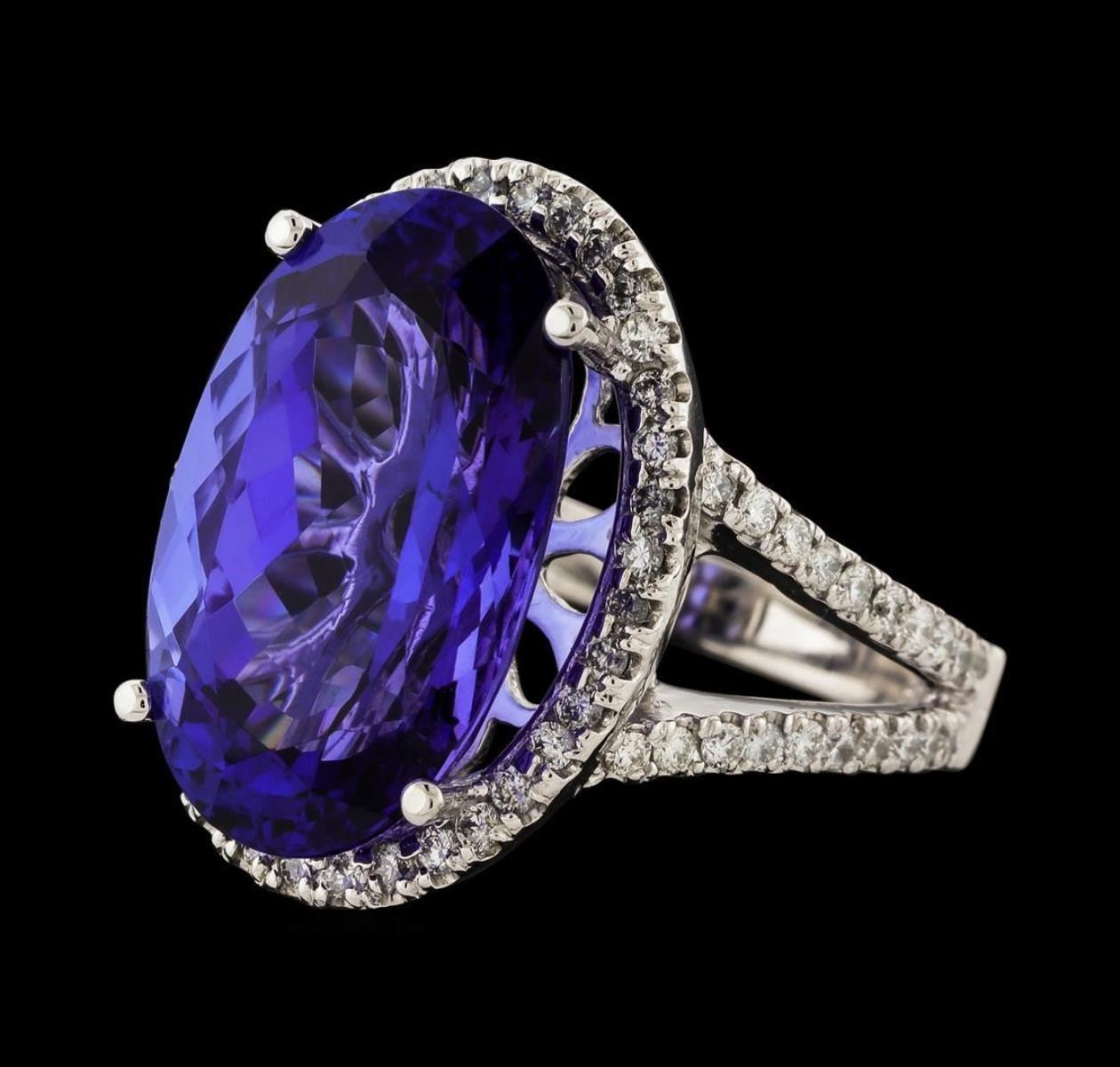 One electronically tested 14KT white gold lady's cast fashion ring with a split cathedral shank with a halo with a bright polish finish. The featured lady's ring has a shank measuring 2.77 millimeters wide. Identified with markings of '14K'. Condition is new, good workmanship. Containing: One prong set oval modified brilliant cut natural tanzanite, measuring 18.28 x 11.44 x 8.25mm, (depth est.) approximate weight of 12.38ct., clarity is eye clean, medium dark, moderately strong, violetish blue color, (GIA vB 6/4), cut is very good. Transmitting light with no distortion, transparent. Colored gemstones are presumed to have been subjected to commonly used enhancement processes. Graded in the setting. Seventy-Six prong set round brilliant cut diamonds, measuring 1.40 - 1.35 x 0.86mm (depth est.) approximate total weight of 76 Stones = 0.75ct. Graded in the setting. Clarity VS-2 to SI-2. Color: H - I Cut Good. Total Weight of Colored Stones 12.38ct.. Total Weight of Diamonds 0.75ct.. Total Weight of Ring 9.40gm. GAS Appraised.