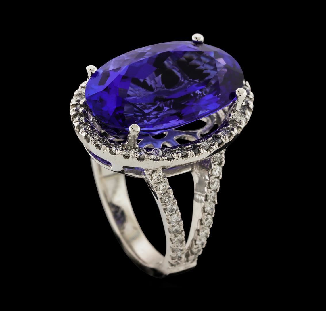 One electronically tested 14KT white gold lady's cast fashion ring with a split cathedral shank with a halo with a bright polish finish. The featured lady's ring has a shank measuring 2.77 millimeters wide. Identified with markings of '14K'. Condition is new, good workmanship. Containing: One prong set oval modified brilliant cut natural tanzanite, measuring 18.28 x 11.44 x 8.25mm, (depth est.) approximate weight of 12.38ct., clarity is eye clean, medium dark, moderately strong, violetish blue color, (GIA vB 6/4), cut is very good. Transmitting light with no distortion, transparent. Colored gemstones are presumed to have been subjected to commonly used enhancement processes. Graded in the setting. Seventy-Six prong set round brilliant cut diamonds, measuring 1.40 - 1.35 x 0.86mm (depth est.) approximate total weight of 76 Stones = 0.75ct. Graded in the setting. Clarity VS-2 to SI-2. Color: H - I Cut Good. Total Weight of Colored Stones 12.38ct.. Total Weight of Diamonds 0.75ct.. Total Weight of Ring 9.40gm. GAS Appraised.