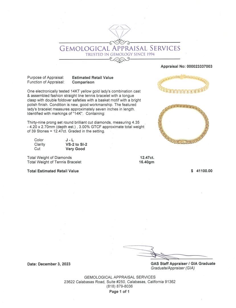 One new 12.47 ctw Diamond Tennis Bracelet - 14KT Yellow Gold. Appraisal Value: $41100. See appraisal for full details.