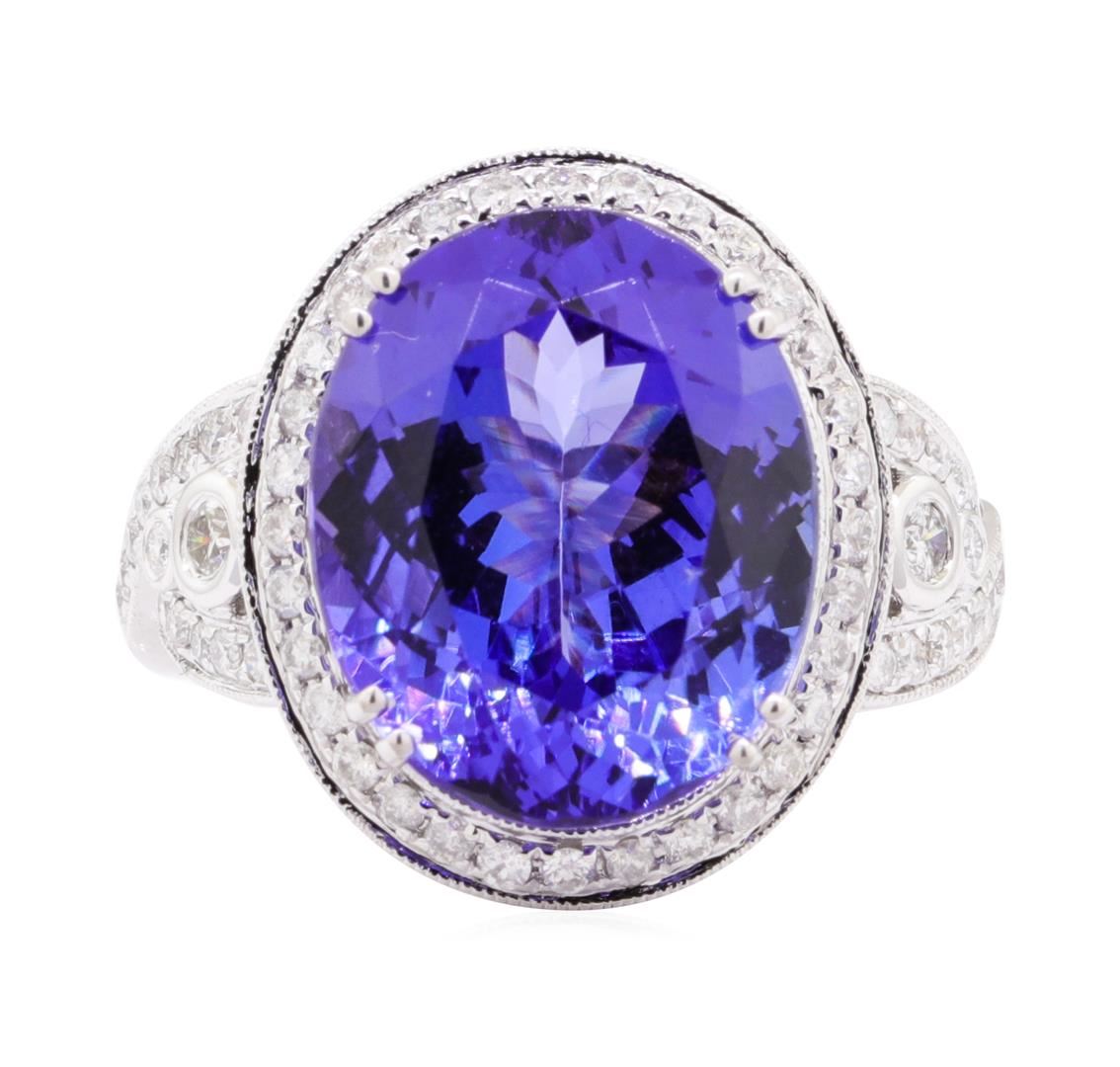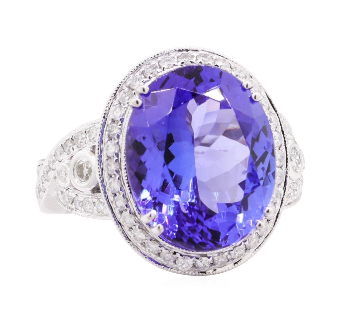 One electronically tested 14KT white gold lady's cast fashion ring with a cathedral halo with a bright polish with milgrain detailing finish. The featured lady's ring has a shank measuring 3.30 millimeters wide. Trademark is Orianne. Identified with markings of '14K'. Condition is new, good workmanship. Containing: One prong set oval modified brilliant cut natural tanzanite, measuring 16.13 x 13.20 x 8.22mm, (depth est.) approximate weight of 12.45ct., clarity is eye clean, medium dark, strong, bluish violet color, (GIA bV 6/5), cut is very good. Colored gemstones are presumed to have been subjected to commonly used enhancement processes. Graded loose prior to setting in the GIA Laboratory, Report #5171951743. Two bezel set round brilliant cut diamonds, measuring 2.20 - 2.15 x 1.35mm (depth est.) approximate total weight of 2 Stones = 0.08ct. Graded in the setting. Color H - I Clarity SI-1 to SI-2 Cut Good Sixty-Eight prong set round brilliant cut diamonds, measuring 1.45 - 1.40 x 0.89mm (depth est.) approximate total weight of 68 Stones = 0.75ct. Graded in the setting. Color H - I Clarity SI-2 to I-1 Cut Good Ten prong set round brilliant cut diamonds, measuring 1.40 - 1.35 x 0.86mm (depth est.) approximate total weight of 10 Stones = 0.10 ct. Graded in the setting. Color H - I Clarity SI-2 to I-1 Cut Good. Total Weight of Colored Stones 12.45ct.. Total Weight of Diamonds 0.93ct.. Total Weight of Ring 11.00gm GAS Appraised at $20220.00. GAS Appraised.