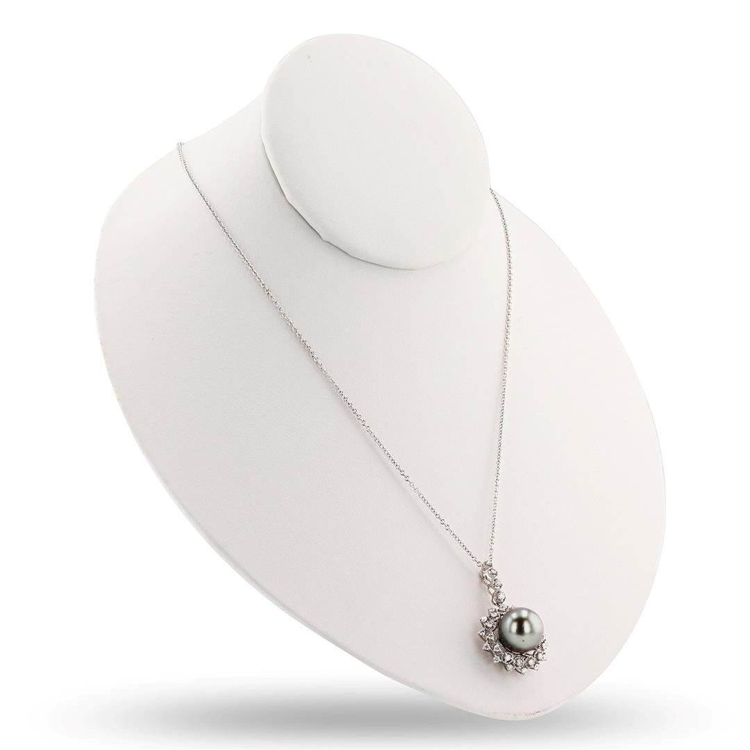 One electronically tested 18KT white gold ladies cast and assembled Tahitian cultured pearl and diamond pendant with chain. Condition is new, good workmanship. The pendant features a tahitian cultured pearl set within a tiered diamond bezel, supported by lattice under gallery and diamond bail, completed with an eighteen inch length chain and lobster claw clasp. Bright polish finish. Trademark is Orianne. Identified with markings of "18K". Containing: One Tahitian pearl, 12.5mm in size. The pearl is silver in color with a very good luster, round, mostly clean Graded in the setting. Tahitian cultured pearls form in the large "Black Lipped" Pinctada Margaritifera oyster, which is about twice the size of the Japanese Akoya oyster. This warm water species from across the central and South Pacific Ocean is at home in the bays and lagoons of the islands and atolls of French Polynesia. Tahitian cultured pearl farmers generally raise their oysters in lagoons. Tahitian cultured pearls take from two to four years to form. Black pearls are known for their iridescent, vibrant, almost metallic natural colors, unique among saltwater cultured pearls. Though commonly called "Tahitian" pearls, they are actually gray, to a lighter or darker degree. Tahitian pearls have the unique ability to display a variety of colors at the same time, which can be seen glistening on their surface. Thirty-two prong set round brilliant cut diamonds. measuring 2.20 - 1.50 x 1.11mm (depth est.) approximate total weight of 32 Stones = 0.73ct. Graded in the setting. Clarity I-1 to I-2 Color F-H Total Weight of Diamonds 0.73ct. Total Weight of Pendant With Chain 9.70 gm