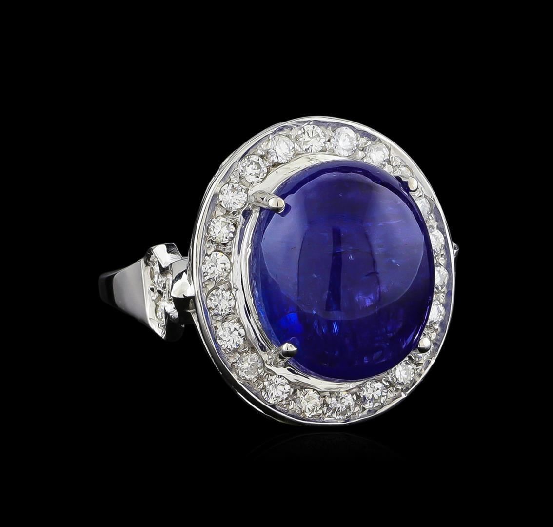 One electronically tested 14KT white gold ladies cast & assembled tanzanite and diamond ring with a bright polish finish. The featured tanzanite is set within a diamond bezel supported by an elaborate diamond accented lattice under gallery and stylized diamond set shoulders, completed by a one millimeter wide band. Condition is new, good workmanship. Containing: One prong set oval cabochon cut natural tanzanite, measuring 14.30 x 11.80 x 7.85mm, exact weight 12.77ct., clarity is heavily included, type I, medium dark, very slightly grayish, bluish violet color, (GIA bV 6/3), cut is good. Transmitting light with a minimum of distortion, transparent. Naturally occurring internal & external characteristics are present. Graded in the setting. Tanzanite is a very rare gemstone that is only found in the country of Tanzania. Originally discovered in 1967. Tiffany & Company, named the stone Tanzanite. It is found in the Usumburu Mountains that border the Umba Valley of northern Tanzania. Tanzanite occurs in gray, brown, violet, blue, reddish-purple, & green. The gem is interesting because of its exceptional pleochroism. Rotated in different directions a tanzanite will exhibit multiple changes of color. Tanzanite has a low tolerance to ultrasonic cleaning, and should not be cleaned using this method. Thirty-Eight prong & bezel set round brilliant cut diamonds, measuring 1.90 - 1.70 x 1.08mm exact total weight 38 Stones = 0.90ct. Graded in the setting. Clarity: SI-2 to I-2. Color: F - H. Total Weight of Colored Stones 12.77ct. Total Weight of Diamonds 0.90ct. Total Weight of Ring 9.46gm. AIG Appraised.
