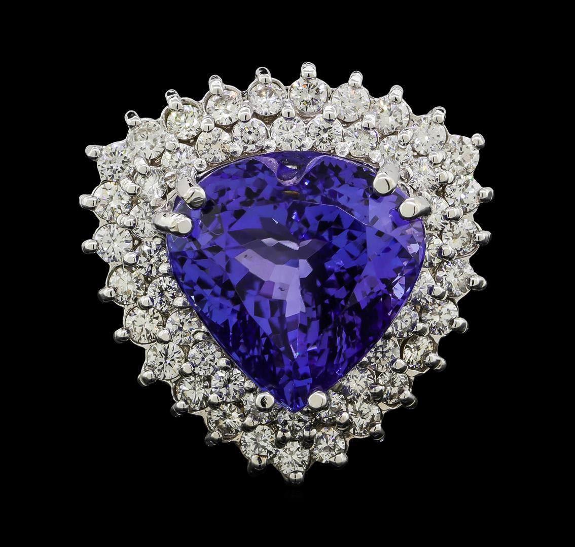 One electronically tested 14KT white gold lady's cast fashion ring with a double basket halo with a bright polish finish. The featured lady's ring has a shank measuring 2.60 millimeters wide. Identified with markings of 'K14'. Condition is new, good workmanship. Containing: One prong set heart modified brilliant cut natural tanzanite, measuring 13.60 x 13.75 x 10.13mm, (depth est.) 4%. bulge factor, approximate weight of 12.81ct., clarity is eye clean, medium dark, moderately strong, violetish blue color, (GIA vB 6/4), cut is good. Transmitting light with no distortion, transparent. Colored gemstones are presumed to have been subjected to commonly used enhancement processes. Graded in the setting. Twenty-Seven prong set round brilliant cut diamonds, measuring 2.10 - 2.00 x 1.25mm (depth est.) approximate total weight of 27 Stones = 0.86ct. Graded in the setting. Clarity SI-1 to SI-2. Color: H - I Cut Good Twenty-Four prong set round brilliant cut diamonds, measuring 1.90 - 1.80 x 1.15mm (depth est.) approximate total weight of 24 Stones = 0.58ct. Graded in the setting. Clarity SI-1 to SI-2. Color: G - I Cut Good. Total Weight of Colored Stones 12.81ct.. Total Weight of Diamonds 1.44ct.. Total Weight of Ring 11.80gm. GAS Appraised at $21,530.00.