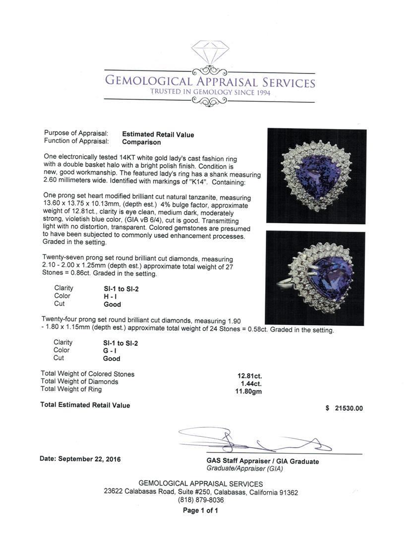 One electronically tested 14KT white gold lady's cast fashion ring with a double basket halo with a bright polish finish. The featured lady's ring has a shank measuring 2.60 millimeters wide. Identified with markings of 'K14'. Condition is new, good workmanship. Containing: One prong set heart modified brilliant cut natural tanzanite, measuring 13.60 x 13.75 x 10.13mm, (depth est.) 4%. bulge factor, approximate weight of 12.81ct., clarity is eye clean, medium dark, moderately strong, violetish blue color, (GIA vB 6/4), cut is good. Transmitting light with no distortion, transparent. Colored gemstones are presumed to have been subjected to commonly used enhancement processes. Graded in the setting. Twenty-Seven prong set round brilliant cut diamonds, measuring 2.10 - 2.00 x 1.25mm (depth est.) approximate total weight of 27 Stones = 0.86ct. Graded in the setting. Clarity SI-1 to SI-2. Color: H - I Cut Good Twenty-Four prong set round brilliant cut diamonds, measuring 1.90 - 1.80 x 1.15mm (depth est.) approximate total weight of 24 Stones = 0.58ct. Graded in the setting. Clarity SI-1 to SI-2. Color: G - I Cut Good. Total Weight of Colored Stones 12.81ct.. Total Weight of Diamonds 1.44ct.. Total Weight of Ring 11.80gm. GAS Appraised.