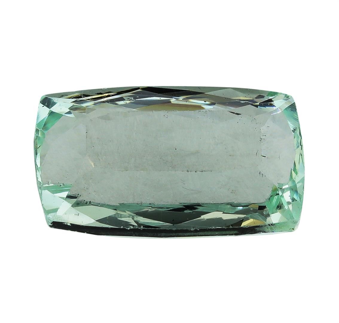 One natural cushion cut aquamarine with an exact weight of 12.90ct., clarity is eye clean, bluish green, medium light. Gemological Appraisals Services estimates the retail value at $4966.5 GAS Appraised.